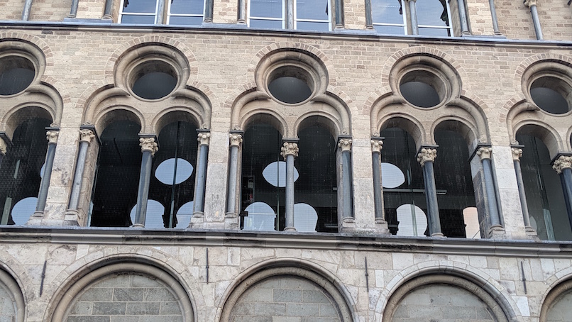 The Overstolzenhaus is a 13th century building that was largely rebuilt to the original design after it was almost destroyed in the Second World War. The building is very distinctive in having a Romanesque design and a stepped gable common to Ducth and Flanders architecture, but less common in Germany. The facade of the building has an attractive row of windows with with arches of multi-circular design that form a sort of clover leaf.
