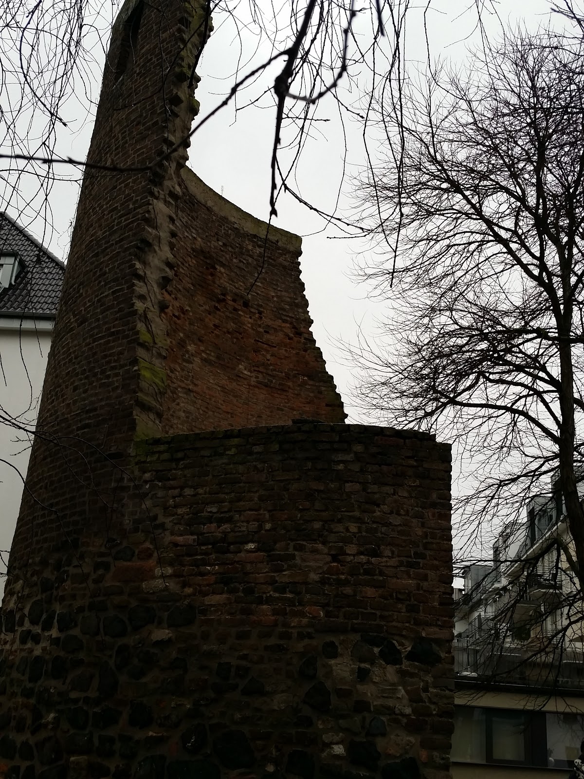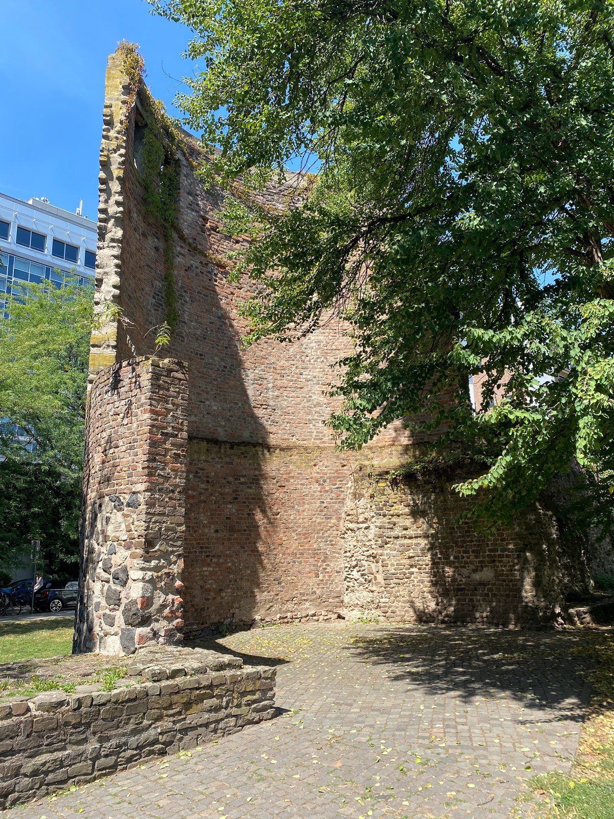 Ein weiterer Römerturm, etwas abseits der großen Straßen. Ein Tafel erklärt, das die Wiese nebenan vor einiger Zeit erneuert werden mußte. Wie mag es vorher ausgesehen haben und warum zerstören bzw. mißhandeln Kölner ihre wichtigsten Geschichtsorte? Ist doch dämlich; wie gut, daß es nun anständig aussieht. Der Turm selbst bzw. seine Überreste, die wie ein hohler Zahn gen Himmel ragen, wird vermutlich nur von jenen Touristen bemerkt und gefunden, die explizit danach suchen. Ich hoffe, es gibt einen speziell römischen Stadtspaziergang, der diesem Turm und seinem Bruder an der Hauptstraße gerecht wird.