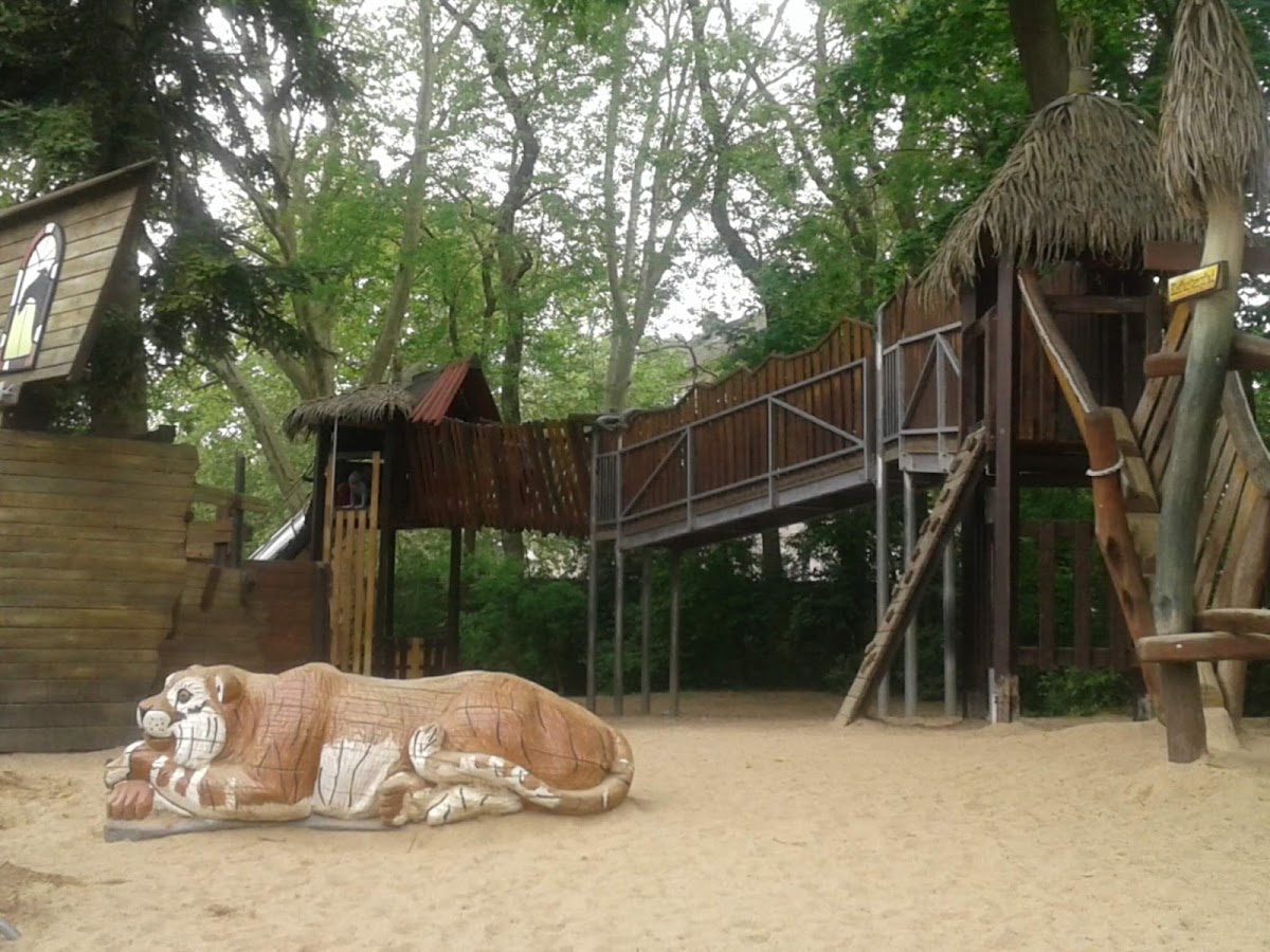 Toller Spielplatz auf dem kleine und große Kinder viel entdecken können. Gut angebunden an das Elefanten Gehege.