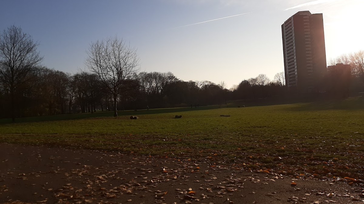 A big green area with some sport facilities like a basketball court, a small skate/bmx parcour and a playground spread around a few acres of land.