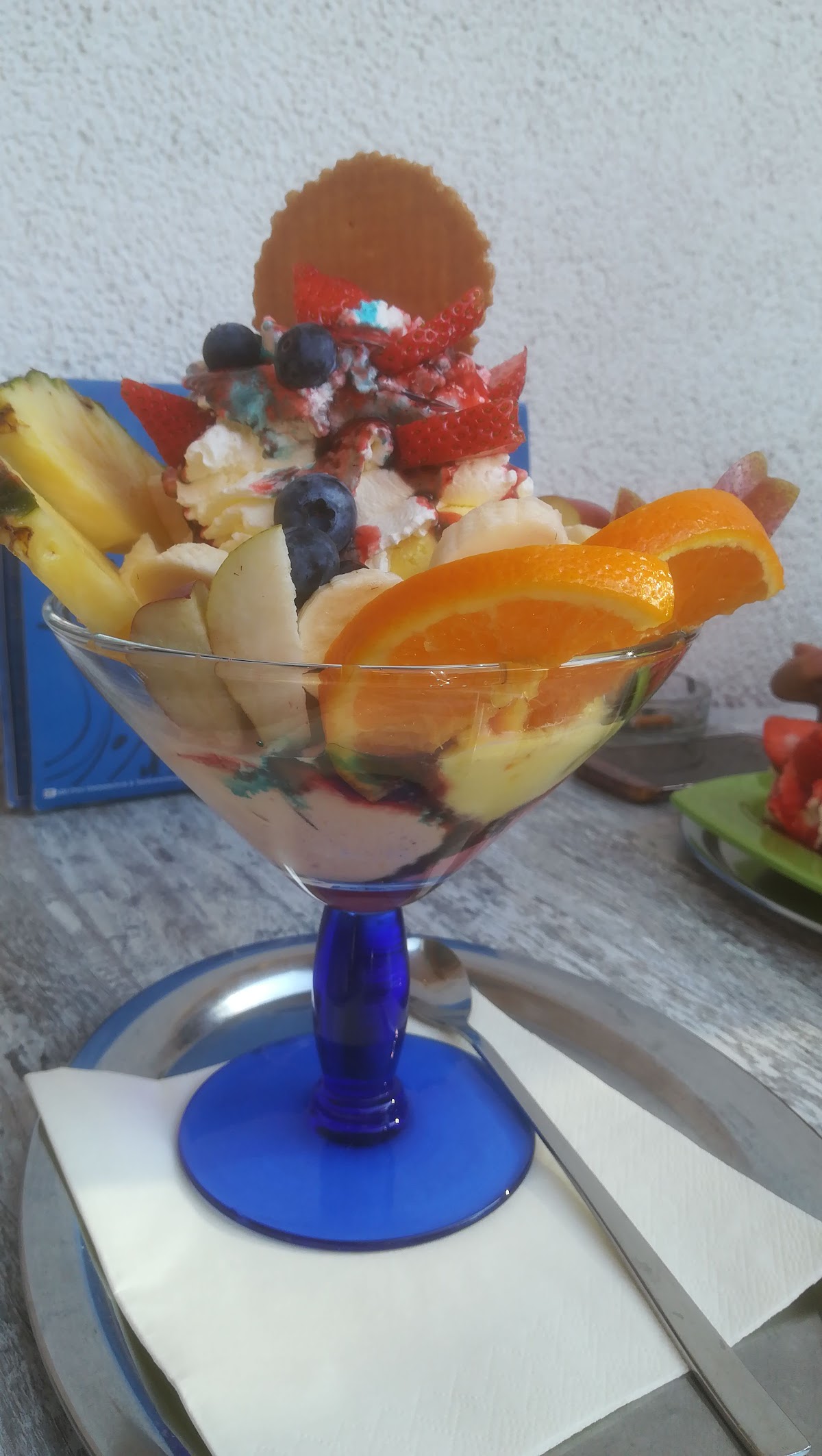 Statt dessen wurde wenig Eis mit sehr viel sahne seviert und statt schokosoße wurden drei verschiedene ekelhaft schmeckende Soßen übergossen die furchtbar künstlich und sauer geschmeckt hat und ein gelegte Kirschen drauf gelegt wurde bei Einen Bananensplit. .,