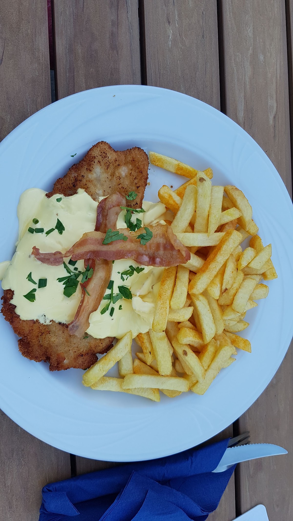 Ein klasse Champignonschnitzel. Die Currywurst am Nachbartisch sah auch so aus, als würde diese Riesenprtion satt machen. Nette Atmosphäre. Fussball gucken macht da bestimmt auch Bock
