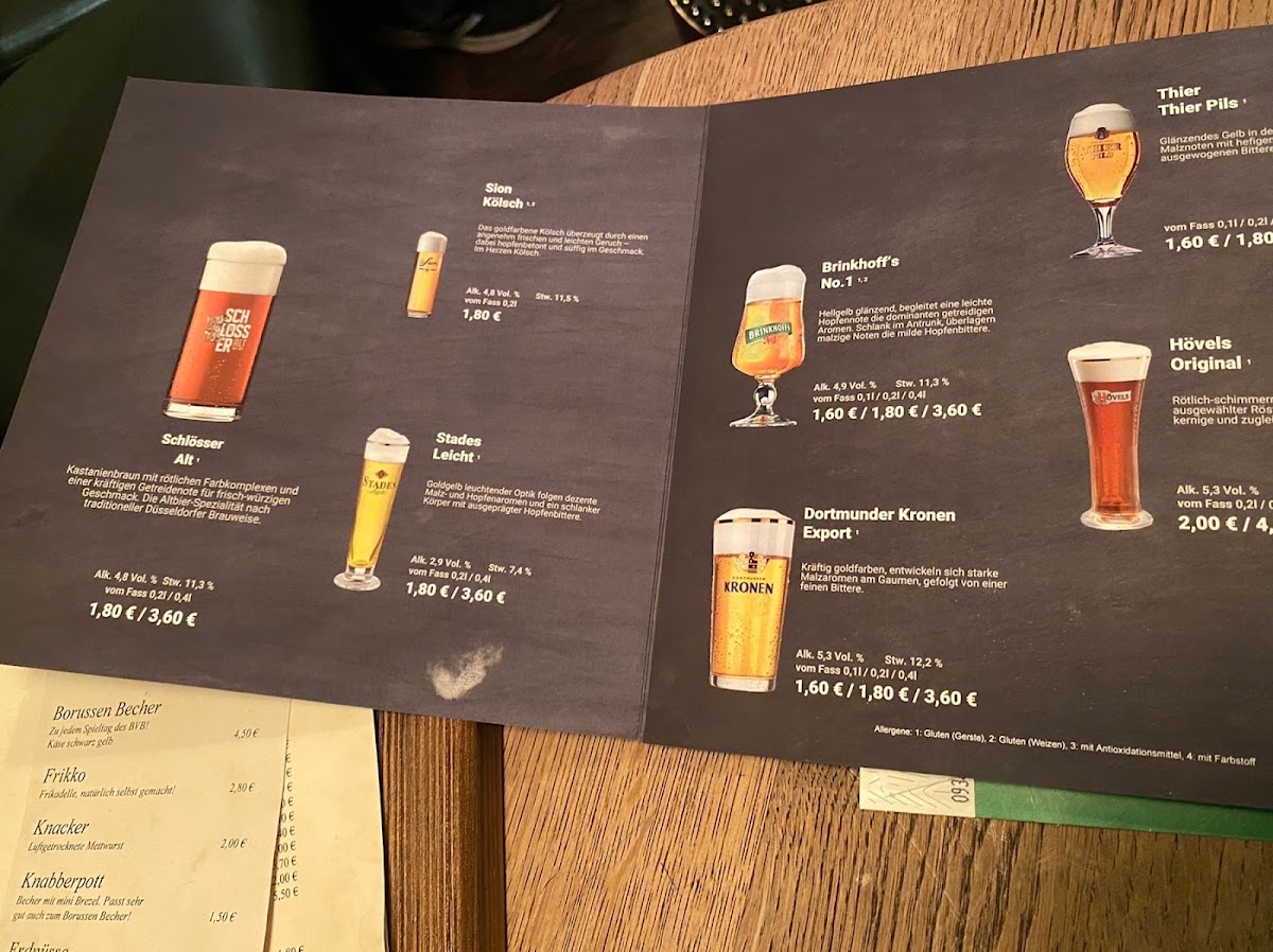 A real local place where not a lot of tourists come, was there on Sunday when Borusia was playing so it was full of locals the pub itself is small around 30 people would fit inside, they have tables outside,but the weather was not that great for them. Beer prices are better than in places nearby 0,4L of beer was 3,6€-4€, if you are planning to visit this place eat elsewhere first as it only has snacks to beer like: Nuts,pretzels,sausages. Could not taste the last one but pretzels where 1,50€ and came in a jar and peanuts 1€ where vacume sealed.