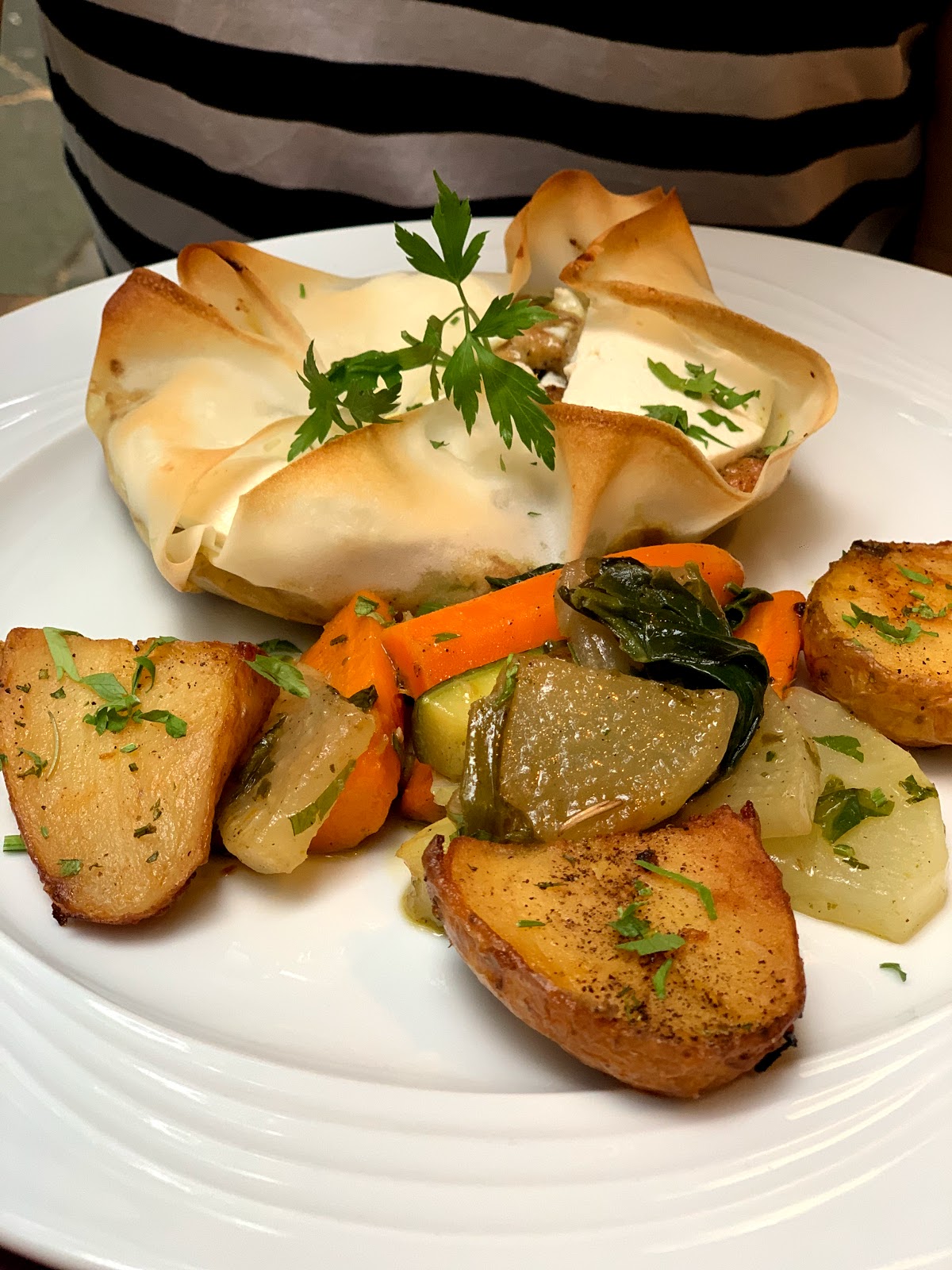 Wir bestellten 2 Vorspeisen, einen Salade de Saison mit offensichtlich selbst gemachten gefüllten Weinblättern, welche sehr weich und schmackhaft waren. Jedenfalls hatte man keinerlei Eindruck das diese, wie in vielen anderen Lokalen, aus der Dose kämen.