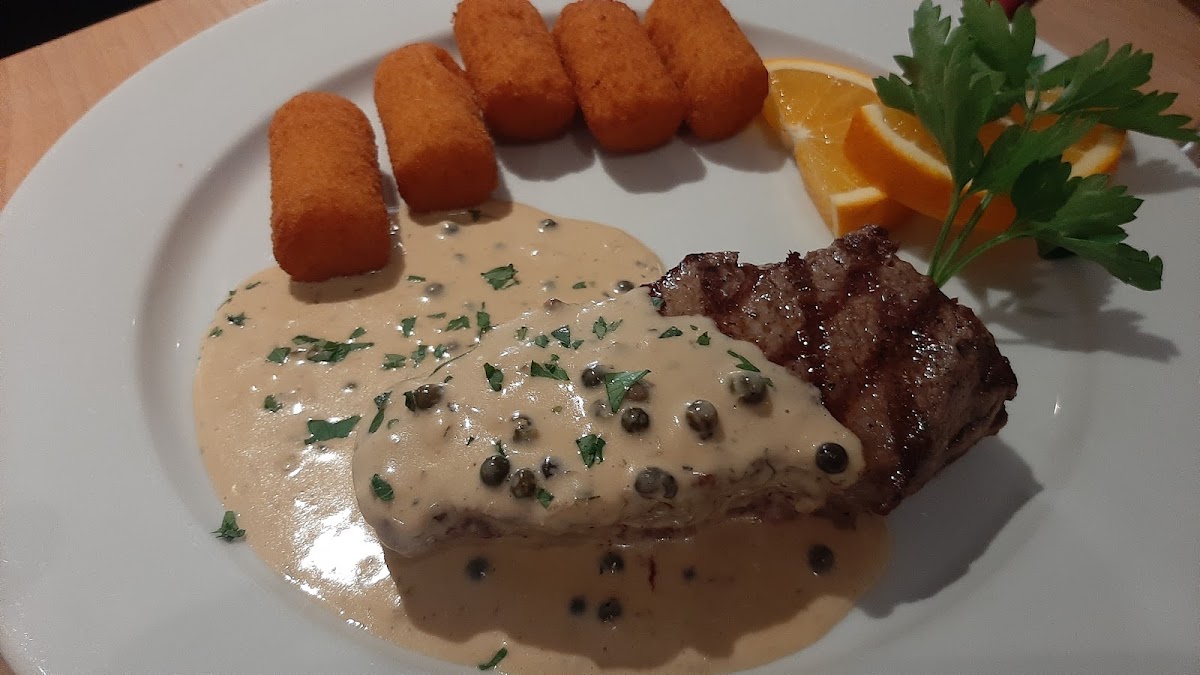 (Translated by Google) The food was very tasty, the meat and the sauce was peppery as it should be, the fries were crispy. Service friendly and courteous, all in all a successful evening.