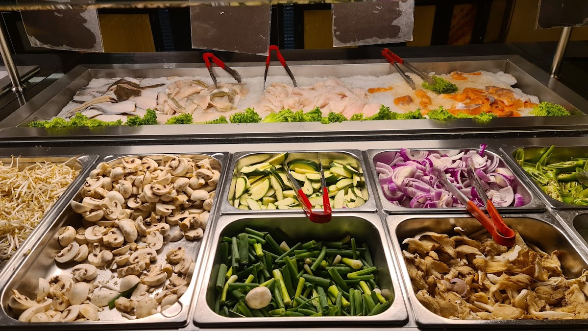 Buffet has a lot choose from. There is a Cold section including sushi, Warm section, Dessert section including chocolate fountain, Drink section and Raw section where you can pick and choose whatever raw meat, vegetables and sauces you want and they will cook it and bring it to your table.