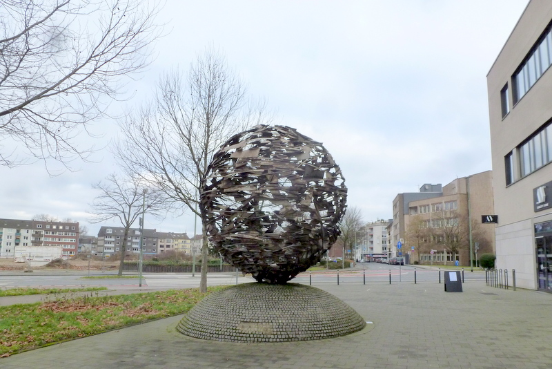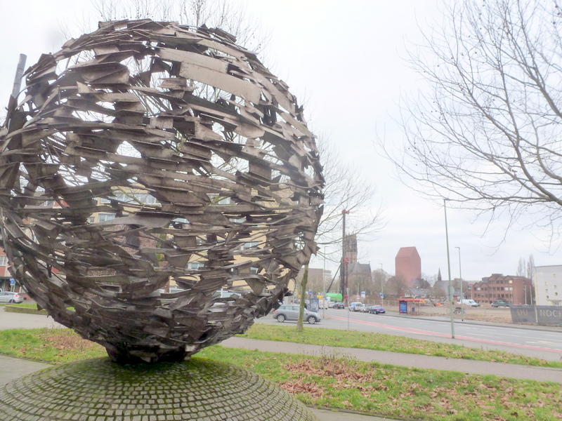 The ball by the artist Friedrich Werthmann, which I saw in Duisburg, shows signs of wear and tear on the individual elements of the welded pieces caused by severe weather, so one could say that it also has stainless steel, a possibly desired property that the work of art from can influence the optics.