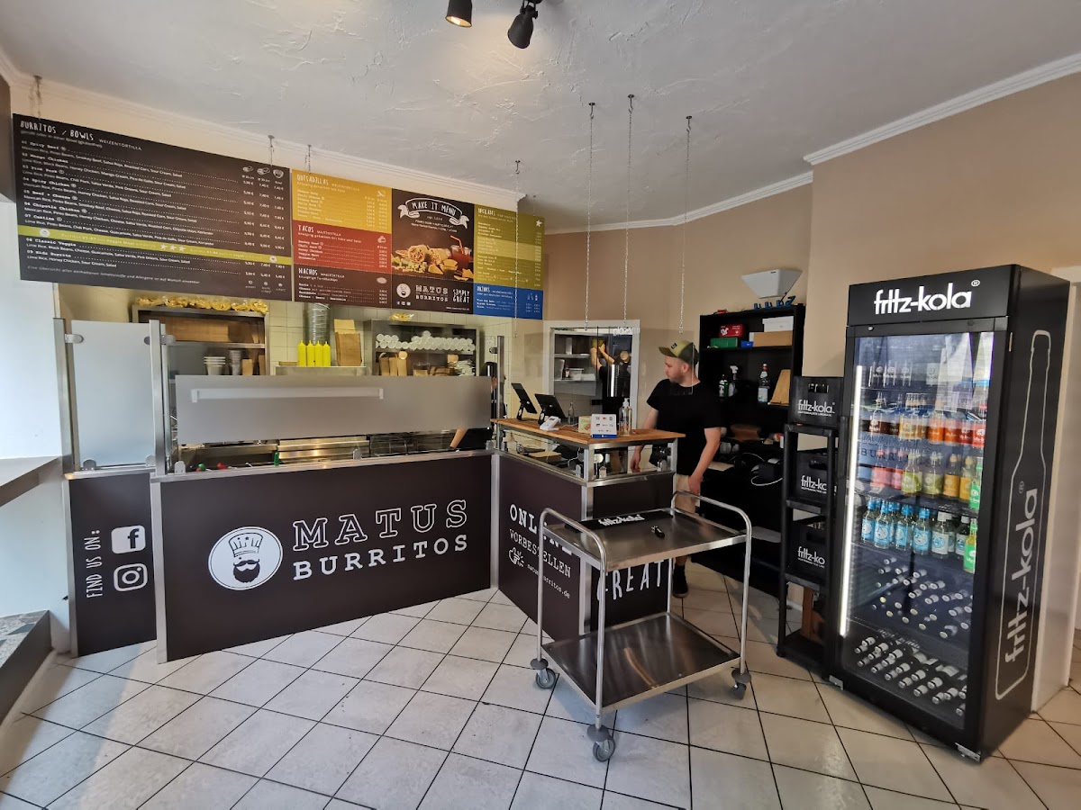 All the goods of Mexican/Californian cuisine. Burritos front u0026 forward, but also quesadillas, tacos, nachos… Sells desserts u0026 hot sauces, and you can get a soft drink. No beer to go alongside the great food though :-( Luckily there are some stores nearby to grab a cold one.