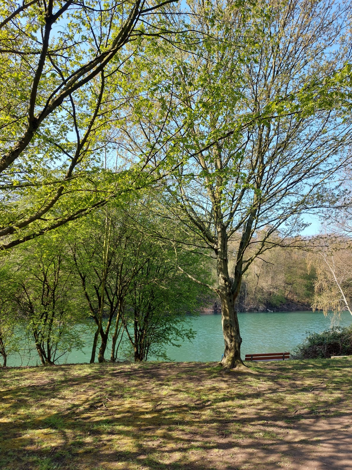 Wir haben eine schöne kleine Runde mit unserem Hund um den See gemacht . Der Weg am Wasser entlang ist schön , das Wasser hat eine schöne Farbe. Doch rechts vom Weg ist auch die laute Autobahn und der Geruch . Störte uns aber nicht. Um den See zurück geht es durch einen kleinen Wald.