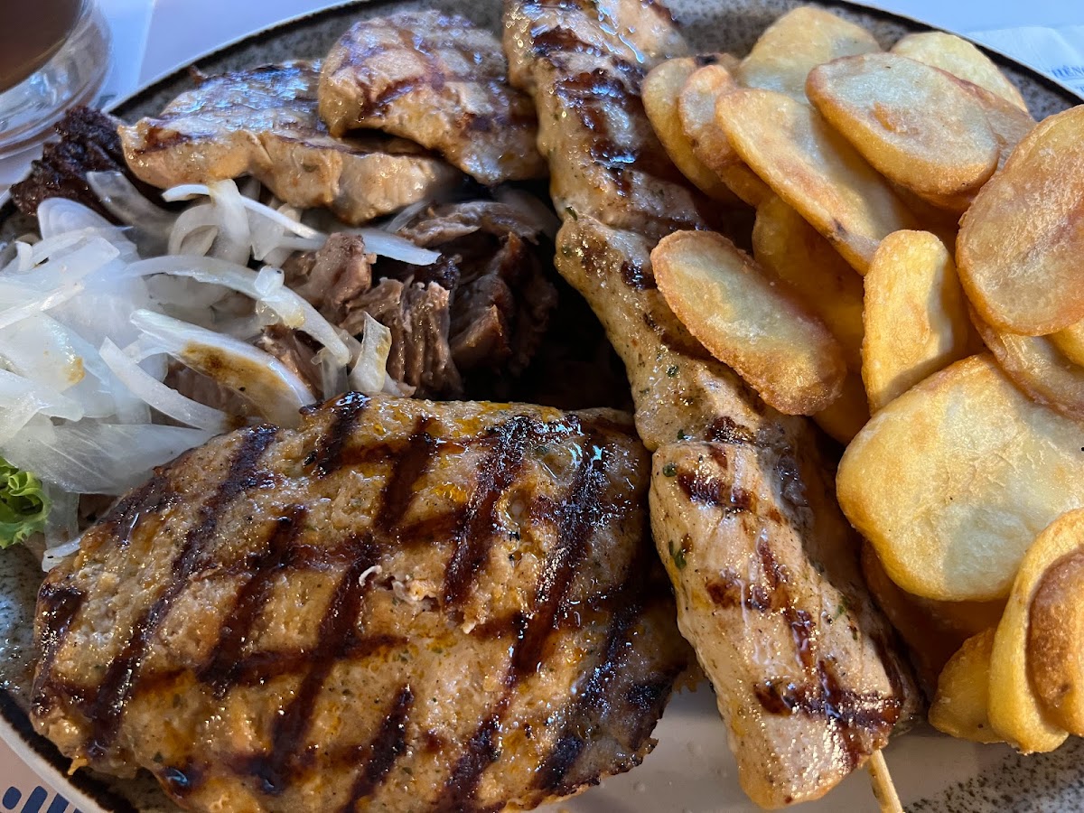 Wir haben draußen gesessen und drei verschiedene Sorten Gyros genossen.