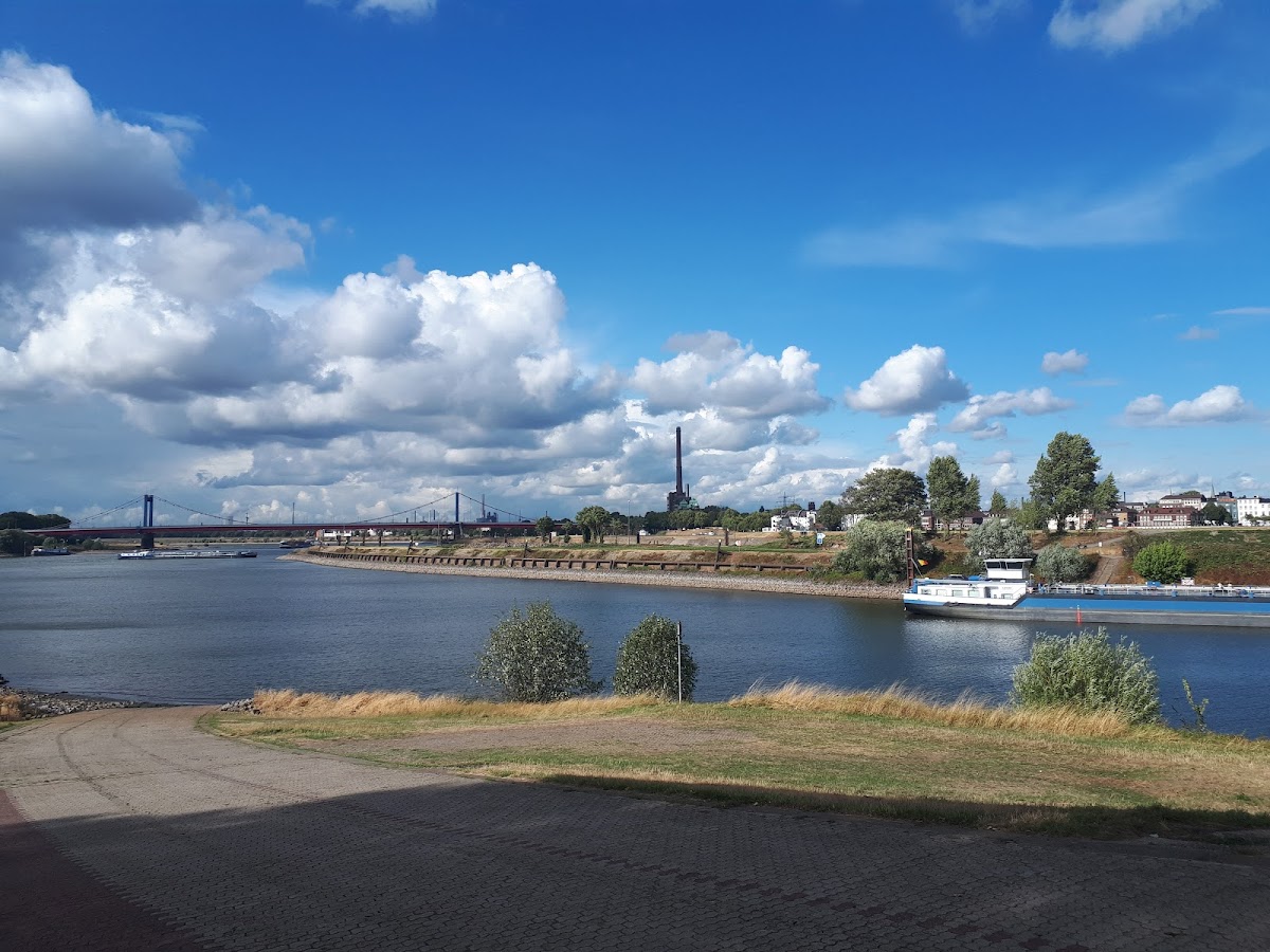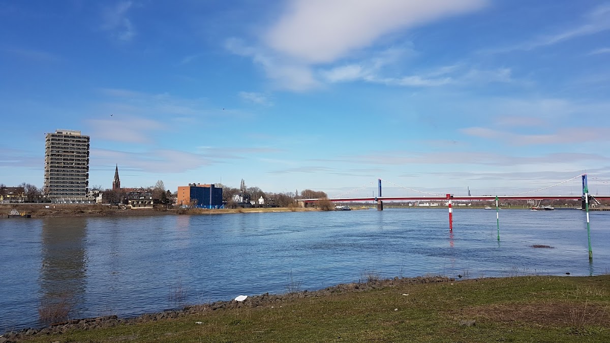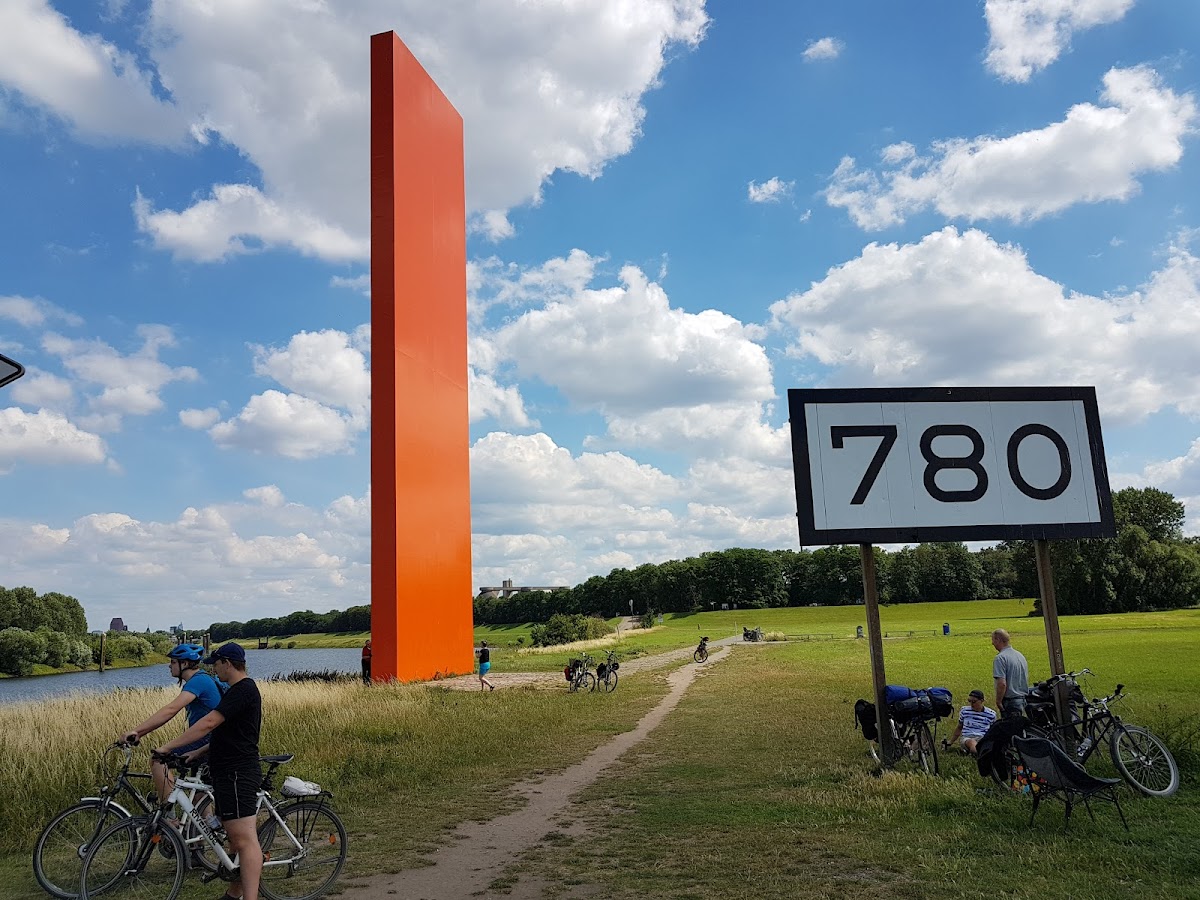 Hochwasser. Flooded. The land mounted sculpture is currently in the water. A pretty bright orange rectangular sculpture marking the spot where the Ruhr flows into the Rhine. Decent park arrangement, very serene location for a breather.