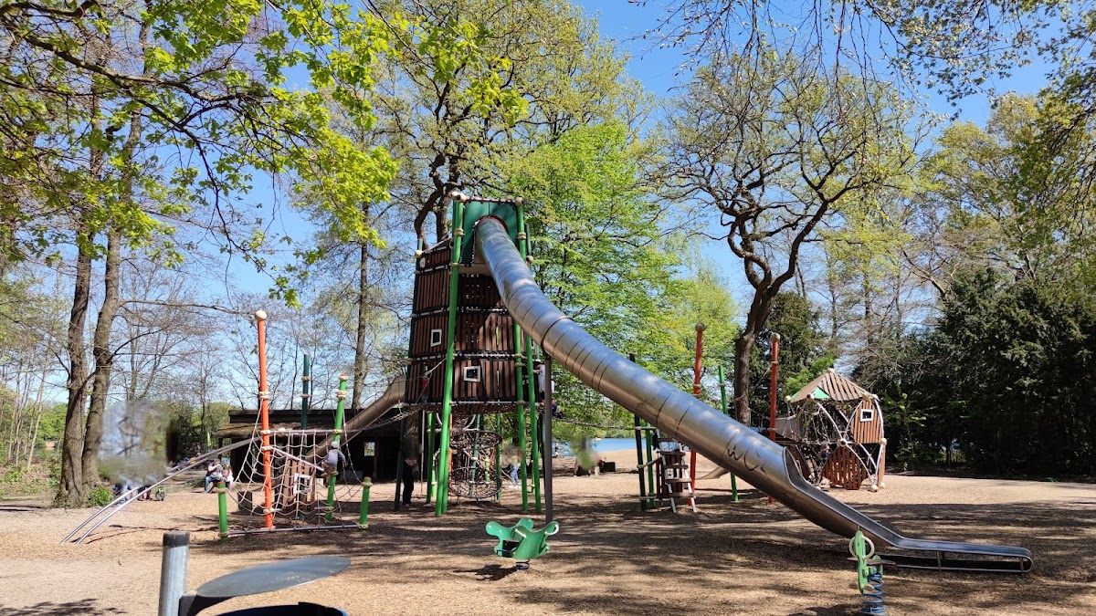 Sehr großer und gut einsichtbarer eingezäunter Spielplatz. Die Wippe ließ sich auch gut für den kleinen benutzen ohne zu hart aufzukommen. Es gab auch eine Attraktion für größere und gute Kletterer die Spitze des Turms Kies sich von aussen erklimmen. Parkplätze direkt neben dem Spielplatz ausreichend vorhanden.