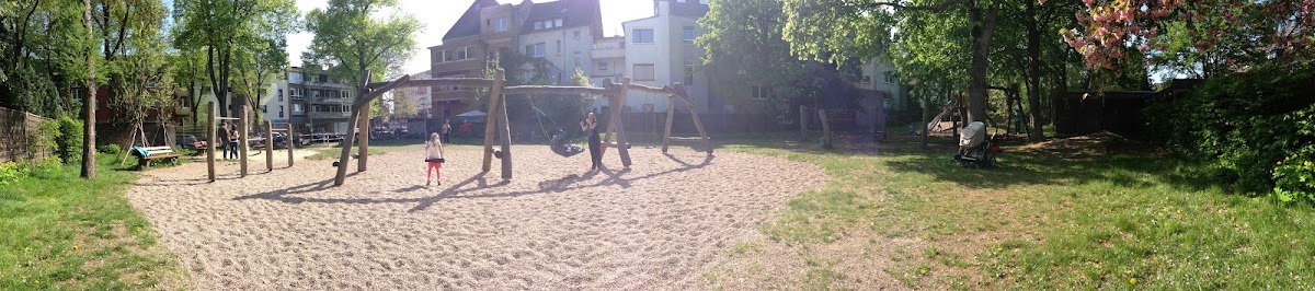 Dies ist ein Park für Kinder mit einer Rutsche Sandspiele mit vier Schaukeln, Grünflächen, einigen Bäumen die Schatten spenden, drei Mülleimern und drei Bänken umgeben den Park.
