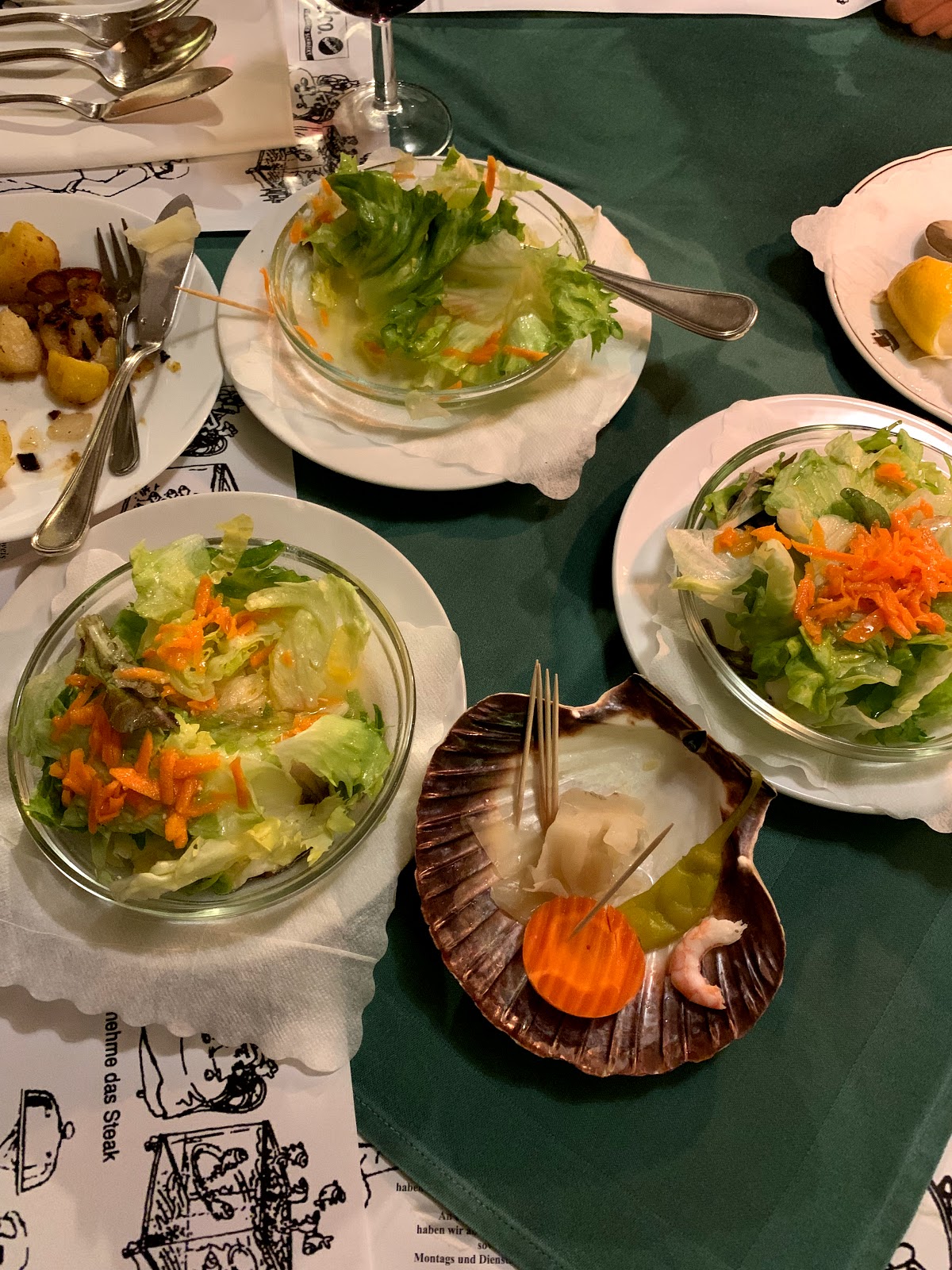 Classic fish restaurant near the Rhine River. We had just taken a little walk along the Rhine River with the dogs and we stopped by this restaurant.A waiter walked up to the car and gave us a sample of roasted potatoes with bacon. If he had not done this, we may have driven away. And the potatoes were tasty and slightly greasy, we we really wanted to try the restaurant. They serve schnitzel and sausage, but because this is primarily a fish restaurant, that’s what all four of us ordered. Our meals were cooked quickly, and perhaps less than 15 minutes. The waiters were very friendly and offered us a menu that included a history of the restaurant in the local town. There were some cute donkeys and a goat grazing next to the restaurant. I think the kids would enjoy seeing them. The waiters brought our food out to the car, and added some extra potatoes. The food was served hot. On the side we had some french fries, and cabbage salad. We all enjoyed our fish. It was not the best I’ve ever tasted, but it was good. I’m glad we tried out this restaurant, and you should give it a try too.