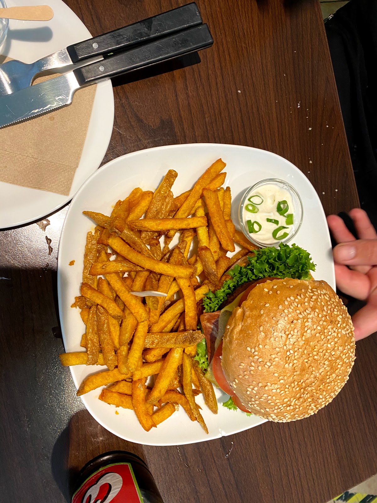 Absolutely amazing, we’ve been vegan for almost 3 years now and this is genuinely the best vegan burger we had. And the fries are delicious too. We got the chicken cheeseburger and added bacon for 1€. Mindblowing. Mayo was outstanding too and the Greek cheese sample we got was lovely. You won’t be disappointed!!!