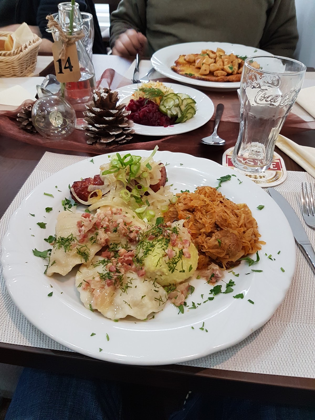 Ein neues polnisches Restaurant in der Innenstadt. Als Appetitanreger bekommt man hier Brot mit selbstgemachtem Schmalz und eingelegten polnischen Gurkenstreifen (wesentlich saurer als das, was man hier so kennt). Ich hatte eine Fleischbrühe mit Nudeln als Vorspeise, die sehr gut war, allerdings etwas fettig. Die Hauptspeise war ein gemischter Teller mit polnischem Sauerkraut (sehr lecker), einer Art gebratenen Mettwurst mit Zwiebeln (Naja), einem Kloß mit Fleischfüllung (sehr fettig und etwas fad), sowie 3 Piroggen mit verschiedenen Füllungen (schwammen leider auch im Fett).