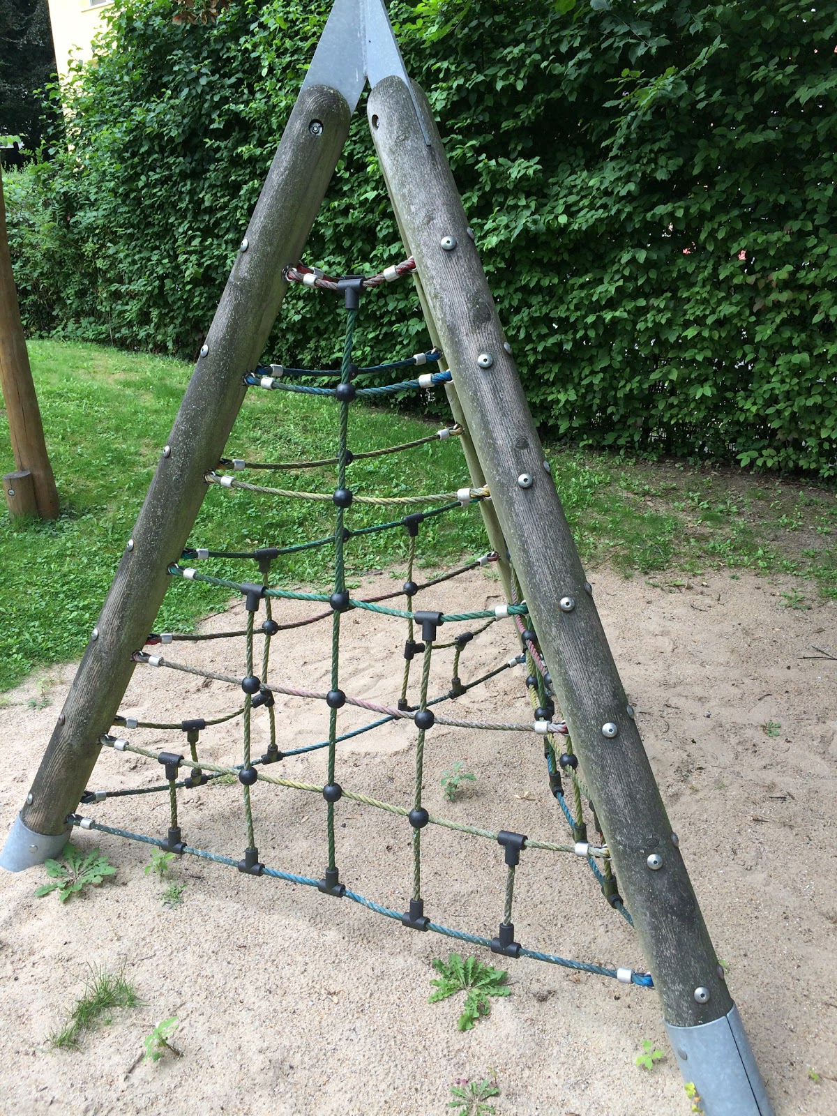 Ein vollumzäunter Spielplatz der einfachsten Ansprüchen gerade so entspricht. Ein Kletterdreieck in Sandkastenkombination und in Geländestruktur eingelassene Holzstreben zur Intensivierung der erworbenen Balancekompetenz stellen die Monumente des Geschehens. Zwei Ruhebänke laden zum Verweilen ein. Zur Ausstattung gehört auch ein großzügig gestalteter Mülleimer. Ingesamt ein spärlich ausgestatteter Platz, der selten Besucher zählt.