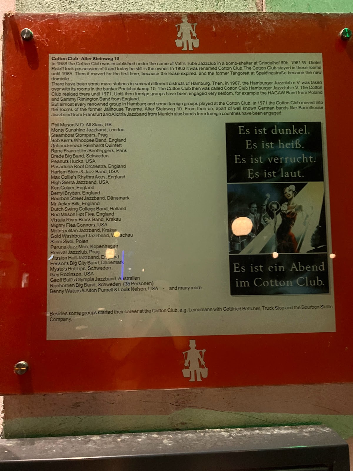 The best jazz club here in Hamburg. You meet quite friendly people here. The selection of concerts remain true to classic jazz and the place is cozy and retro.