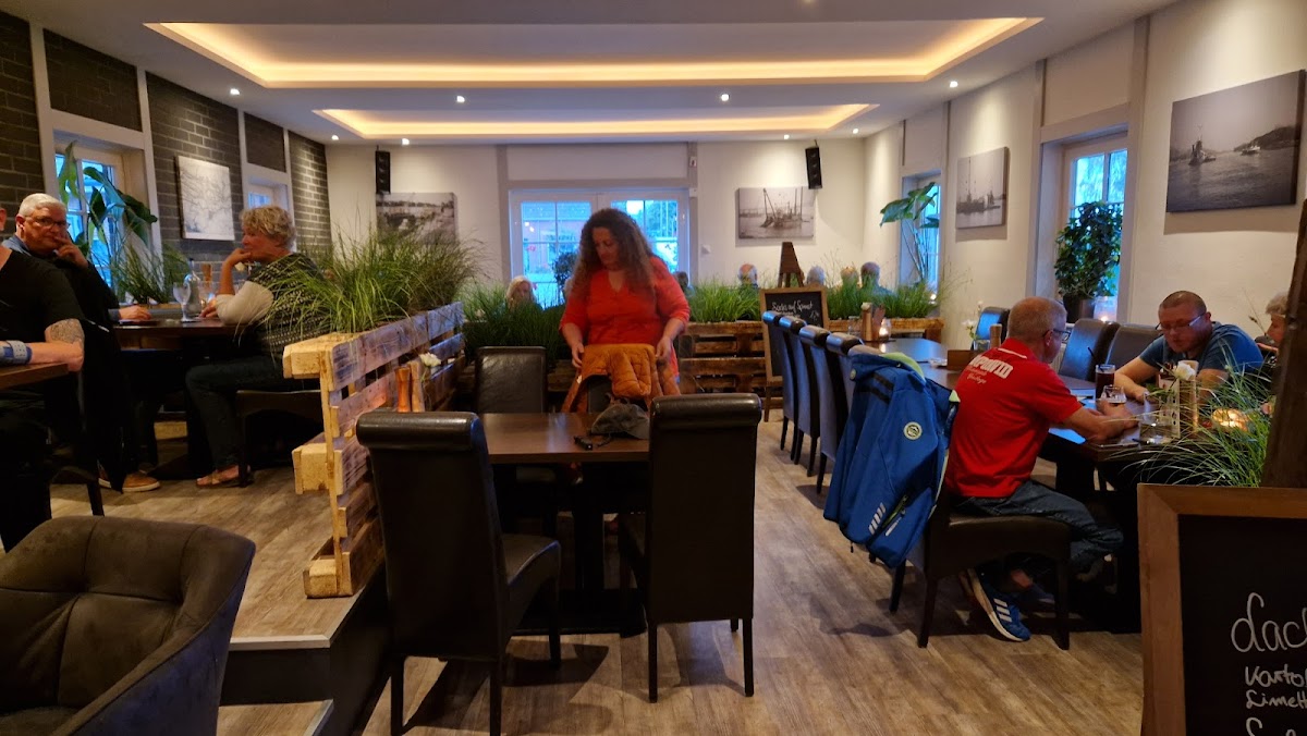 (Translated by Google) We are always pleased to find a restaurant on a pitch. It was particularly busy here and we had to postpone our evening meal and reserve it in advance. No problem on vacation. The ambience is maritime and well chosen in the implementation. The comfort factor sets in immediately. Due to the size of the room, the general volume can be classified as high. The staff (2 people in the service) friendly, slightly uncoordinated. Empty aisles should be rented out if "empties" (except for glasses) take up table space unnecessarily.