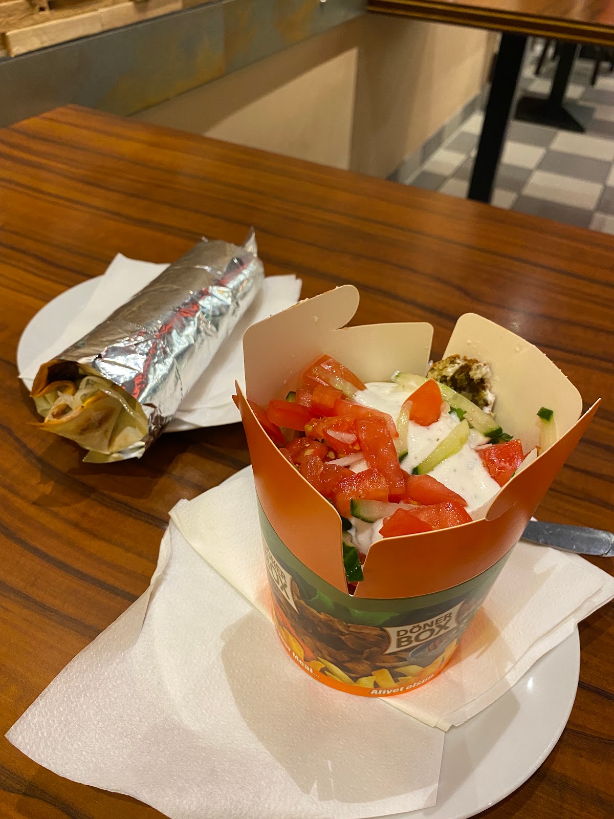 Food was okay when drunk, but they would greatly overdue unwashed yellow onions to the detriment of the döner, their falafel was downright dry and the chicken was not exactly juicy to put it nicely.