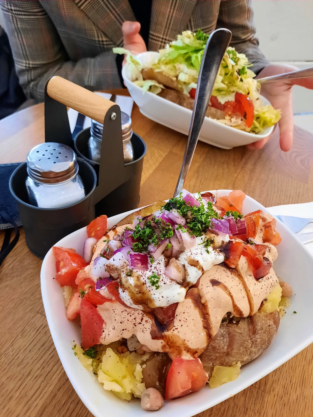 We got three vegan filled potatoes and one vegetarian with goat cheese and all of them were cleaned to the peel.