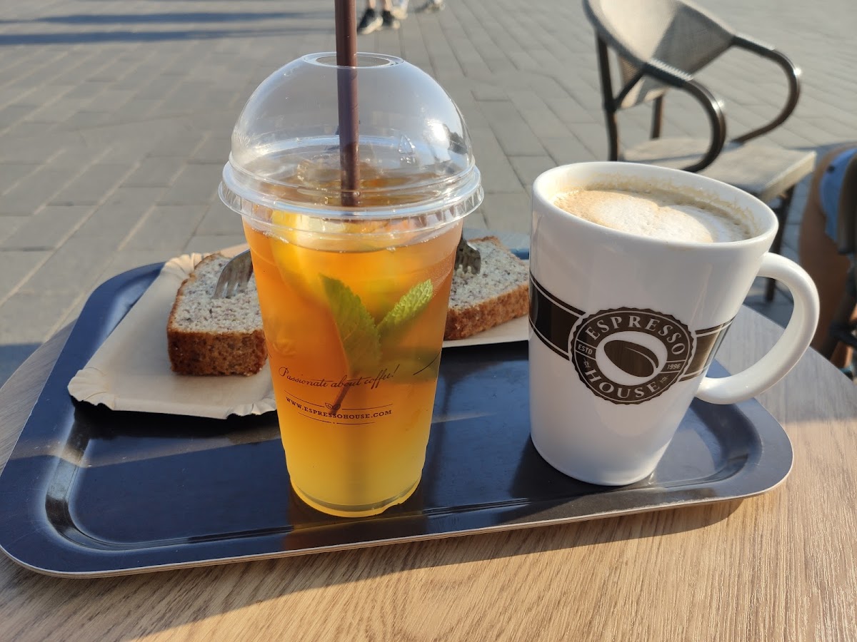 Cinnamon latte was supposed to be less sweet (just 2 pumps) but the bottle was almost empty , so I had no Sirup. But plenty cinnamon powder on top, oat milk was tasty, accepting own cups (with a discount!) was a great touch. Staff was really relaxed and friendly. Didn't try the food, but it looked great.