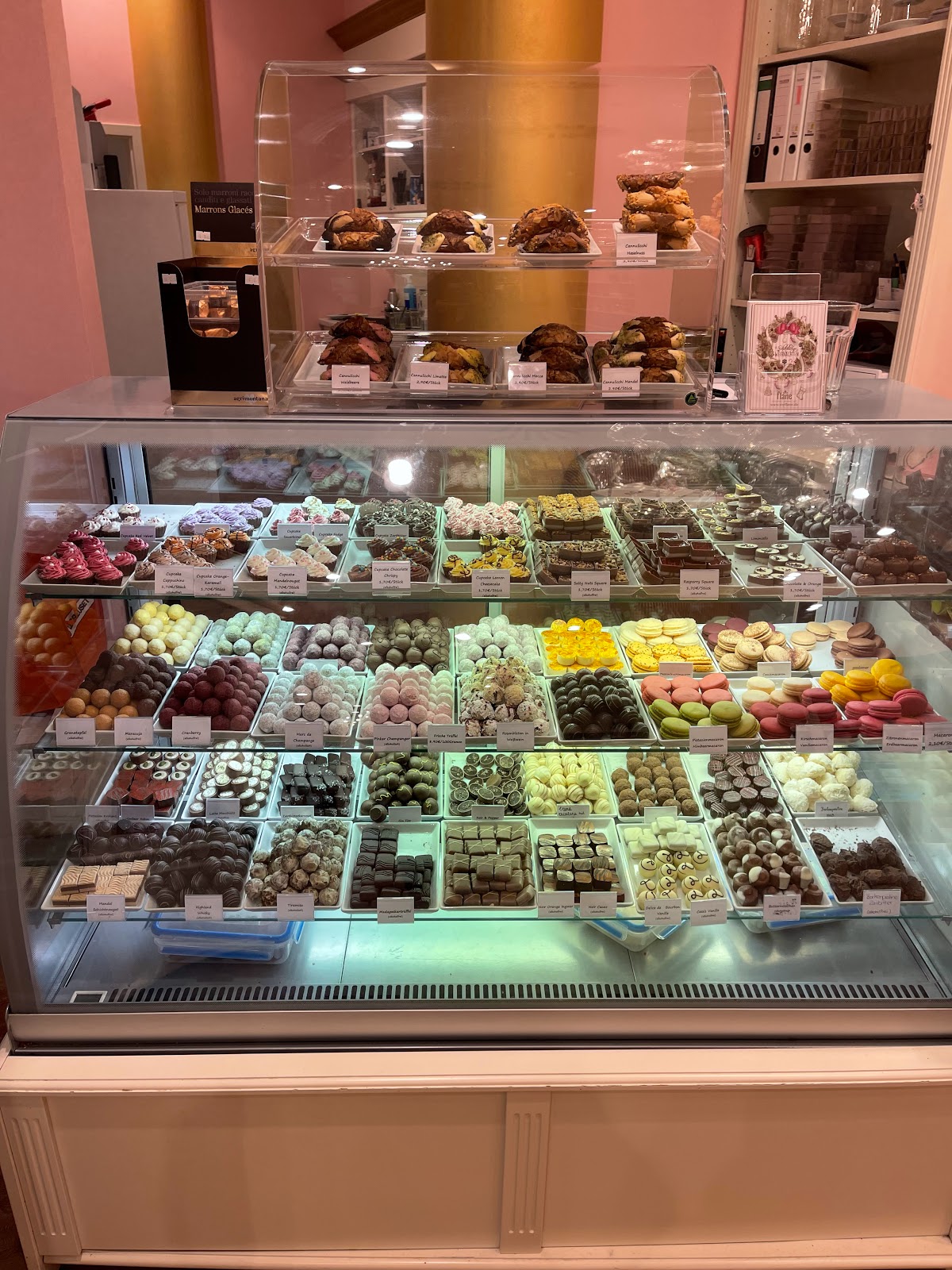 Wonderful selection of chocolates. Helpful and friendly staff. They also offer tasty freshly made waffles, even with warm cherries! Coffee is not too special. Price is good for center area.