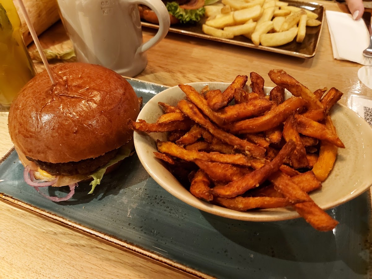 So we were at the entrance for about 10 minutes with the staff behind the bar only looking at us until I gave up and sat ourselves. Service was great then, we took all the recommendations from the staffs. It's a very fresh, for young people ish (du basis, loud music, and dim lighting) restaurant which is comfortable. Food was great, but there wasn't any choices other than burger, should we have known? Probably. All the menu is in German btw, but I'm sure the server would be glad to explain if you'd asked. Price was okay, more on the expensive side, but since there was like truffle oil and blue cheese (which was good!!) there can't really expect otherwise. Waited like 10-15 minutes to pay and had to call out to the waiter to.