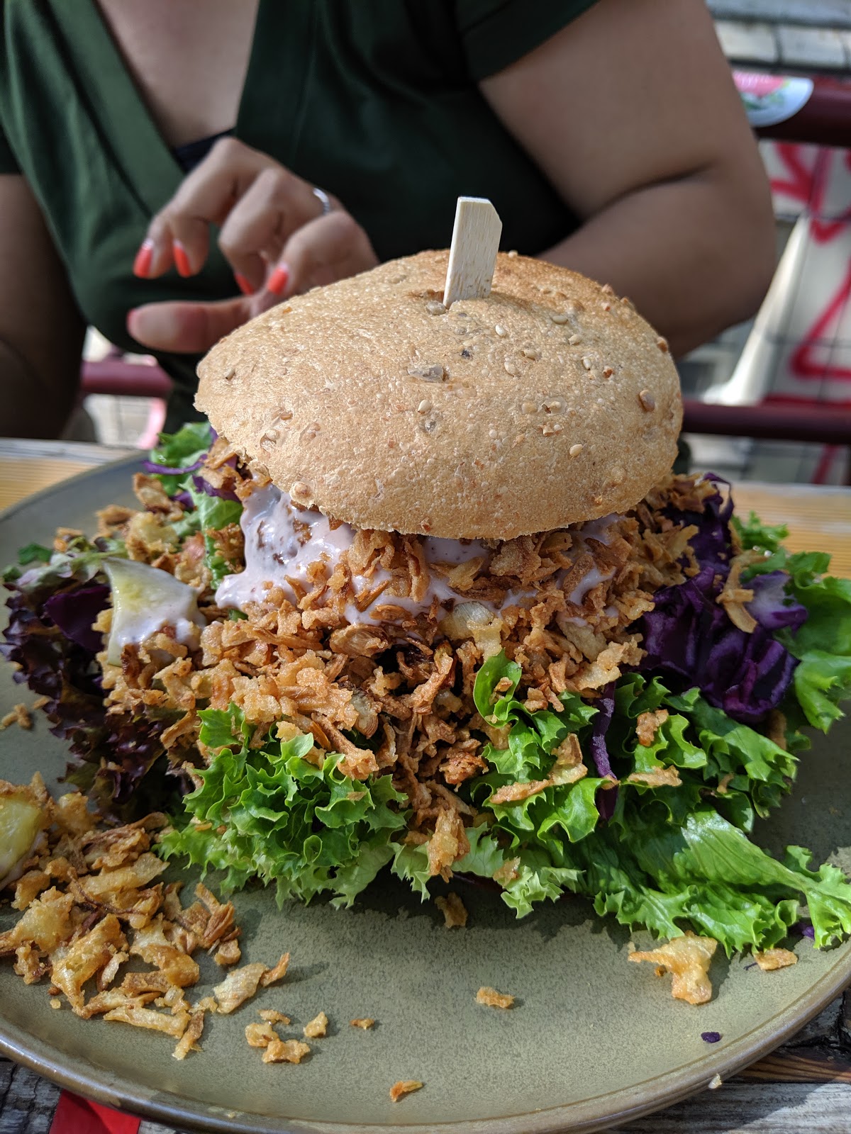 Definitely a great place to eat if you're vegan, or even if you're not! This place specializes in various vegan burgers or burger bowls. They also have a variety of vegan cakes. Portion sizes are big. The service here is excellent though. They're super friendly and willing to help you out with an English translation of the menu. They also accept credit cards which is not always the case for Hamburg.