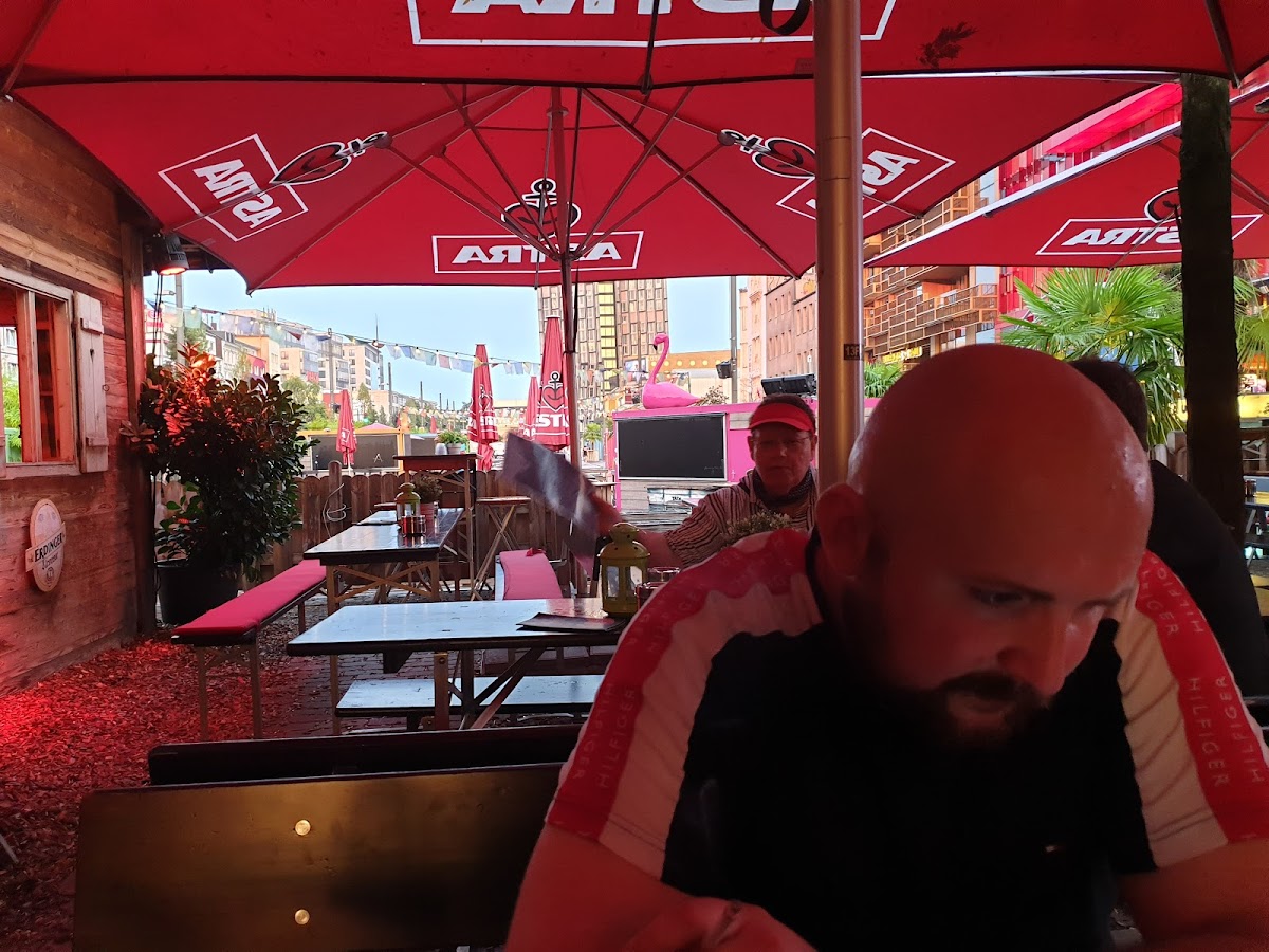 A nice place to sit outside and have some drinks. They have the heaters outside so even in the late evenings it’s not too cold. The Currywurst is delicious, the fries with sour cream okay. I also liked the music they play. The service is great there.