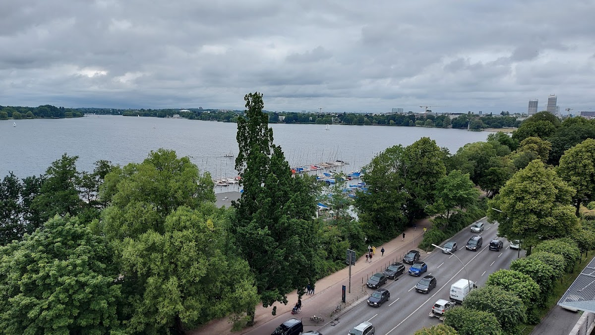 Lovely rooftop bar with amazing views over the Alster, get there early to get an outdoor table.