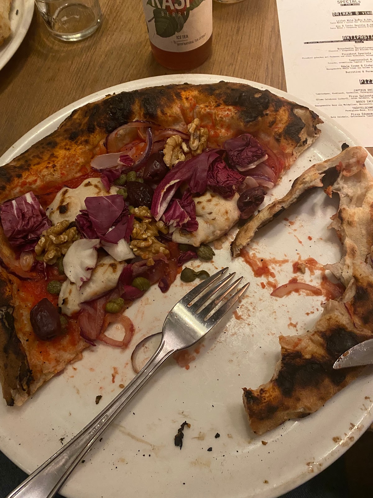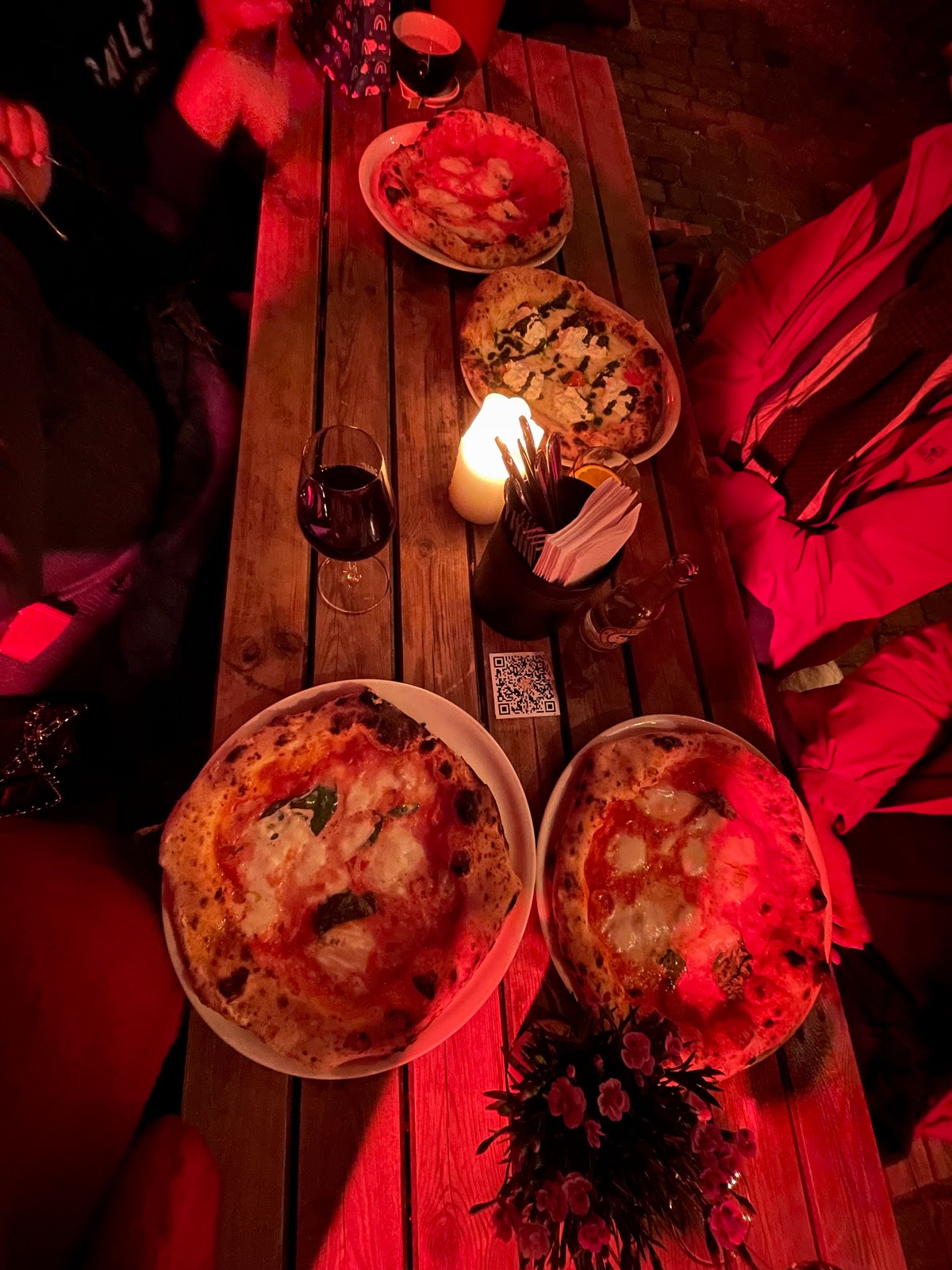 We came here because we were craving pizza, we waited for 20' for a table (which was fine!). There was a menu on the table with 5 different pizzas we thought it was the only menu but judging for other pics and google comments seems like that's a sort of premium menu not the regular one which we were never offered or whatsoever , the waiter did not know the difference btw the aperol normal and Aperol Toscana (all offers from their menu), apart from the drinks we ordered a big bottle water which for we didn't get any glasses, we asked for them but they never came so we had to finish the aperols to drink the water ... my partner ordered a pizza he liked and I ordered one pizza named Trüffelschweine ( veggie) turns out there was no truffle in it which was very disappointing on the other hand it had so much cream cheese that I feel sick about it afterwards and was throwing up once at home.