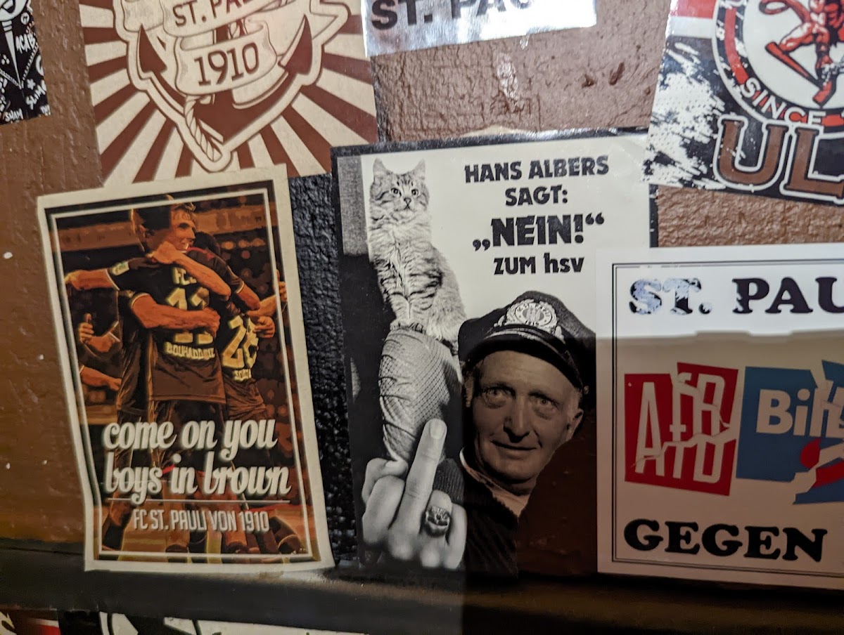 The Jolly Roger, the legendary supporter’s-owned bar near the stadium. Founded by St. Pauli Fans for St. Pauli Fans. It’s a non-profit enterprise with all monies going into supporters projects. It’s located at Budapester Straße across the road from the Millerntor stadium and a 5 minutes’ walk (or 10 depending on how many Astra’s consumed) from the Reeperbahn.