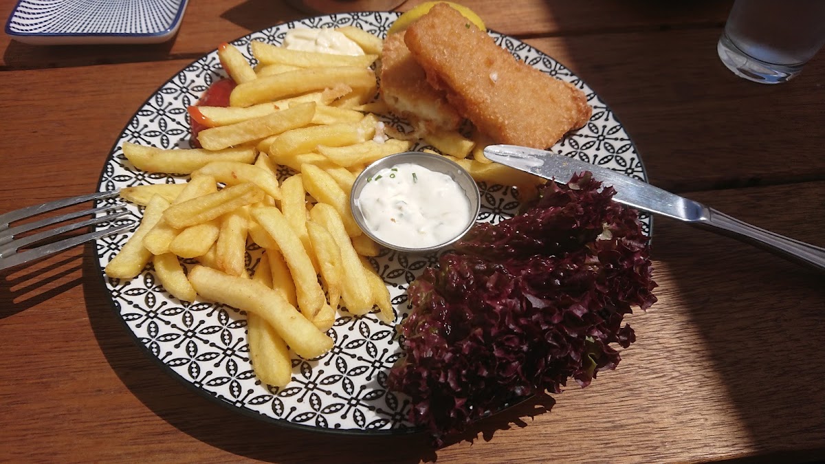 Nice terrace, fish and chips at a very competitive price for Hamburg and the neighborhood, kind and helpful waiter.