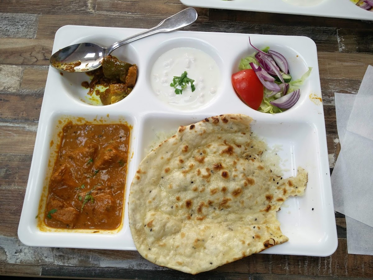 The food is North Indian. You can order a Thali for dinner (main dish, 1 naan bread, some basmati rice, little salad, yogurt) drink Mango lassi or Almond Milk.