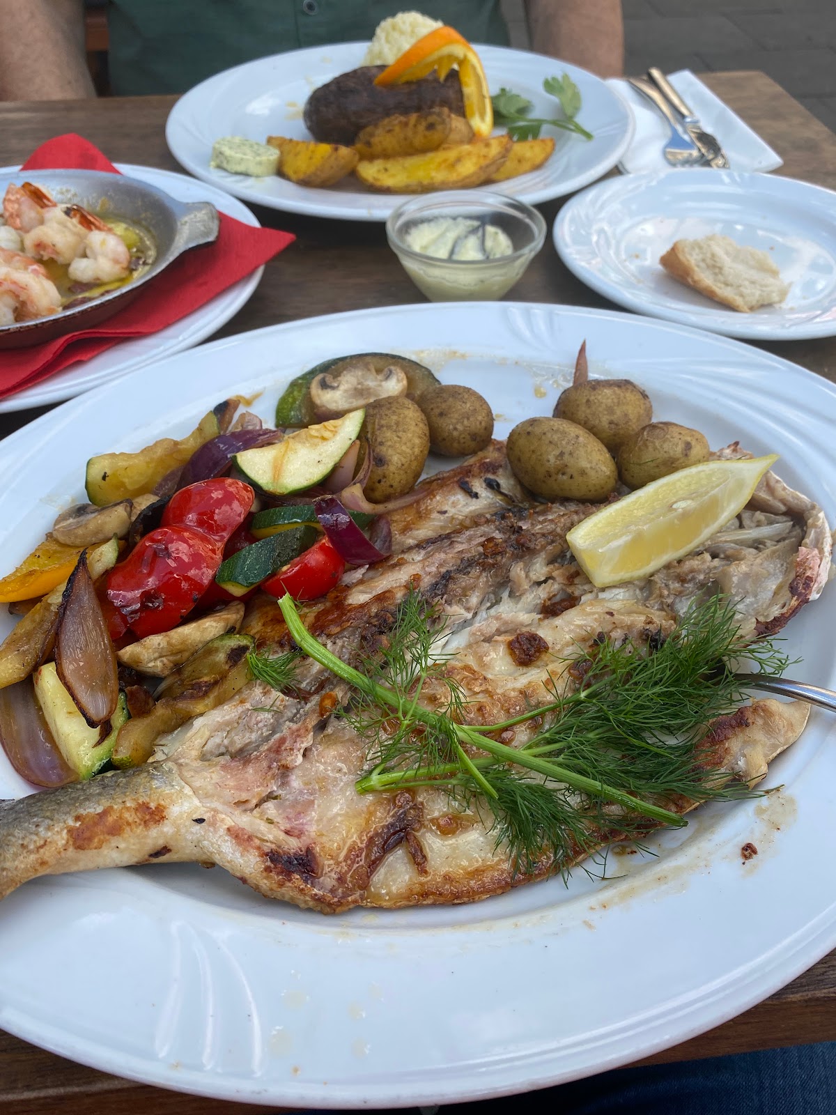 Nice portugués Resturant. We sat outside enjoyed the bustling vibe and the beautiful weather. The servers are nice and prompt. Steak is tender but you may want to order it cooked medium vs medium rare. It was too rare. We also ordered the grilled sea bass. Be careful of the fish bones but it was cooked to perfection(a bit oily for my taste). You must try the pear soaked in red wine dessert. It was extremely yummy. Worth a try when visiting Portuguese quarter!