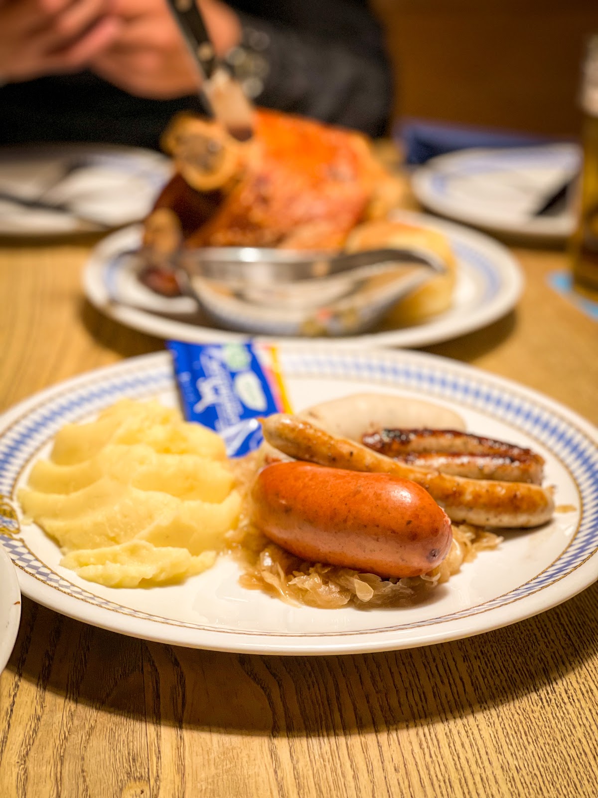 Our big waiter gave us great recommendations of all the famous Bavarian dishes. Our orders covered them all that included sausages, sauerkraut, veggies, knuckle of pork and cold beers.