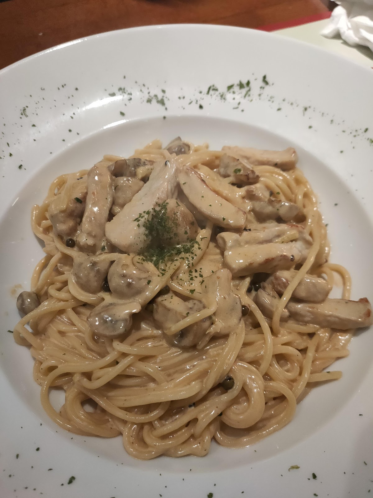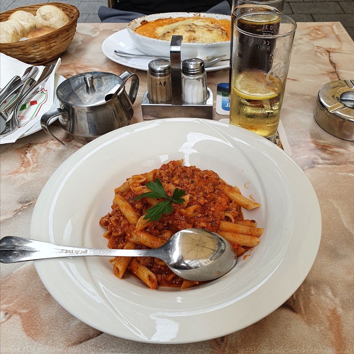 The outside seating was a lovely lunchtime sun trap, I visited late April. The food was good, we had four seasons pizza and snitzel, both good, the pizza particularly so. Many others were also eating pizza and pasta, what I saw all looked good. I can't comment on interior. Waiters were friendly and service was good. Price was reasonable.