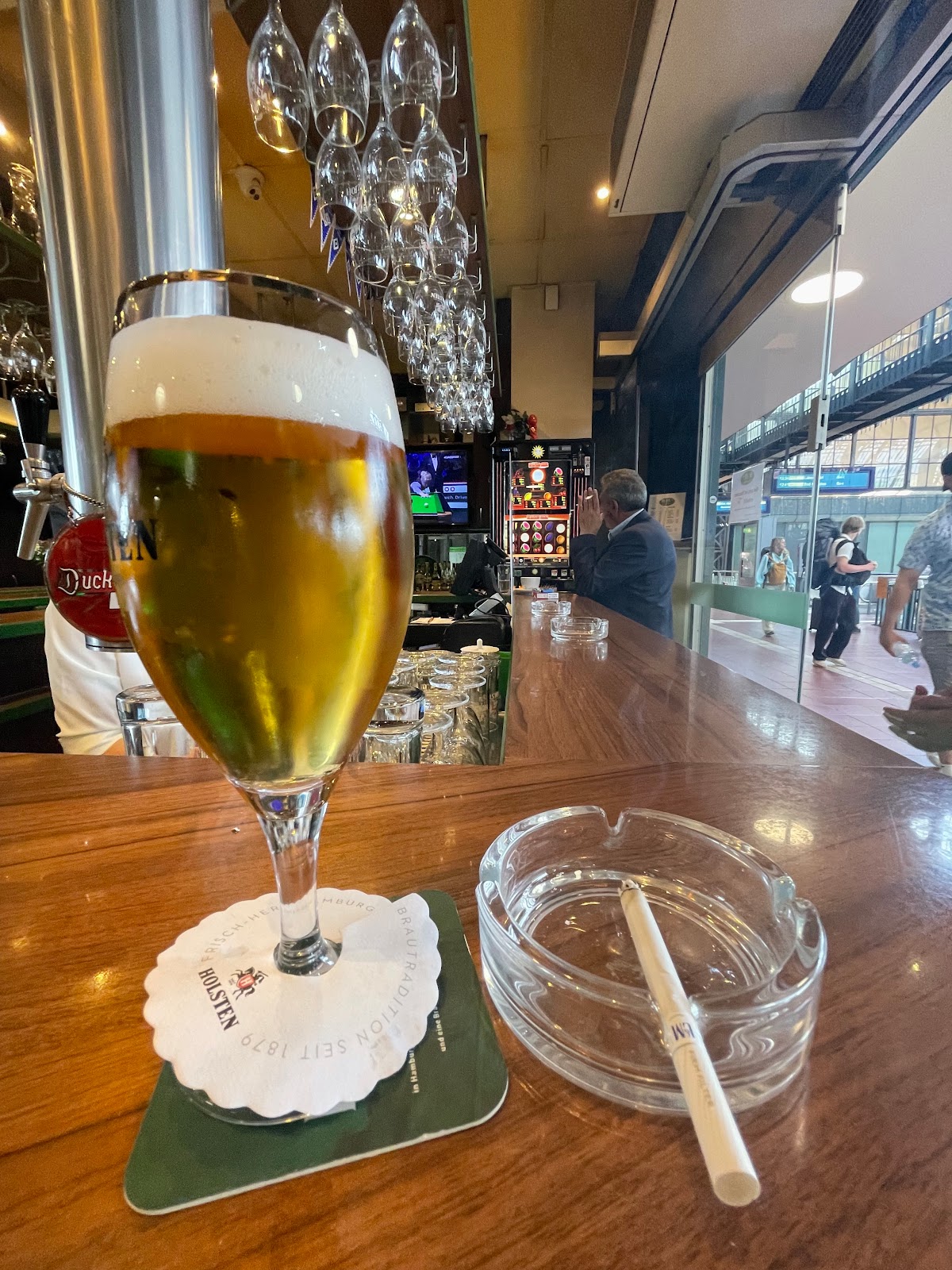 Tiny but very friendly bar (capacity, even in normal times, about 15) above the tracks in Hamburg Hbf. People are all so close together round the bar that they can't avoid talking to each other.
