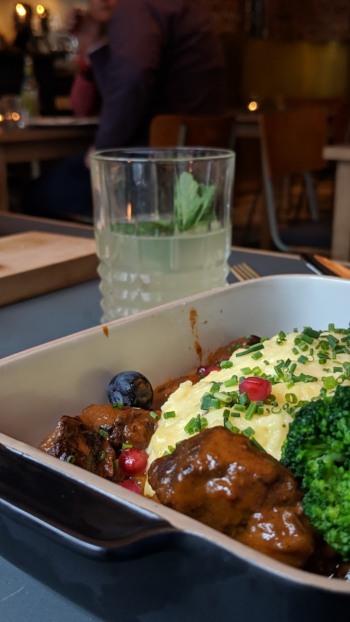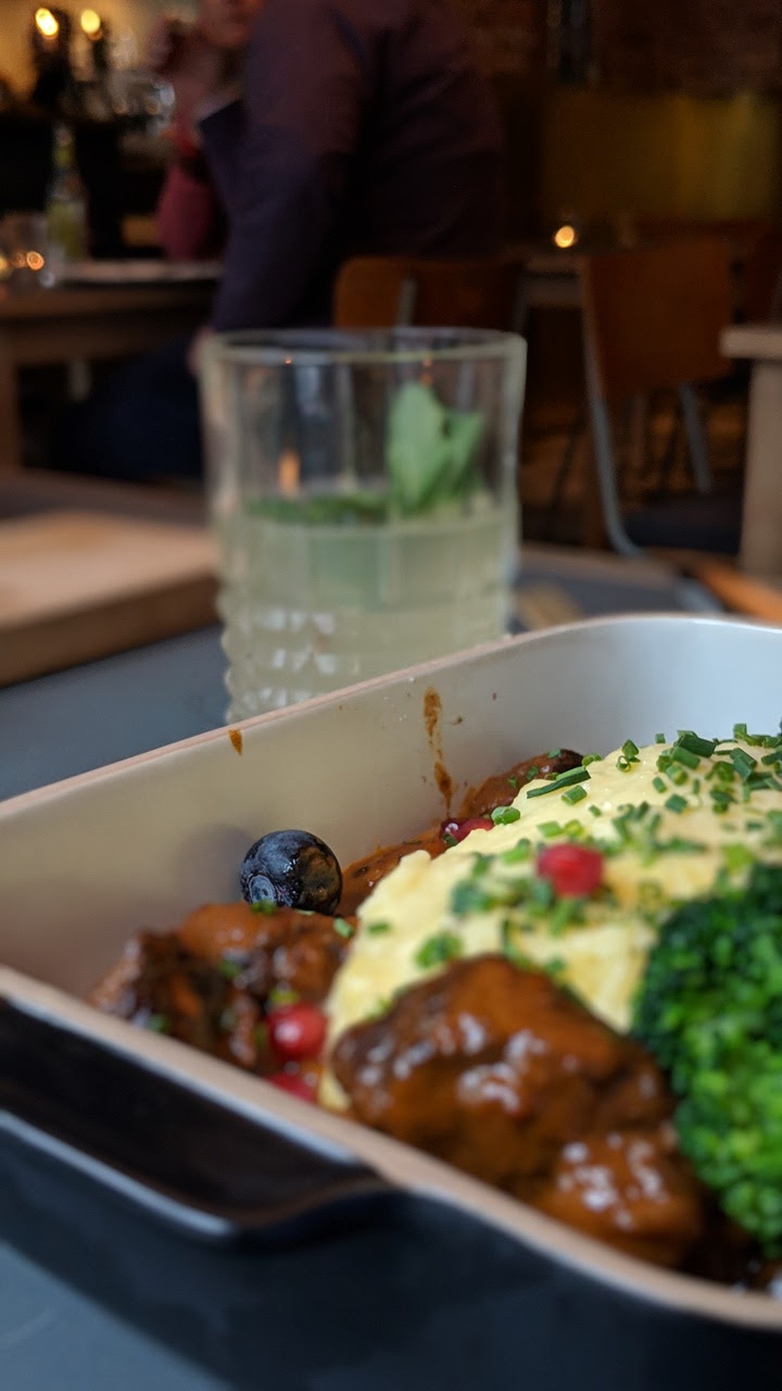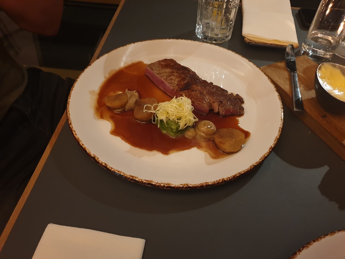 (Translated by Google) Well, I've been there twice now, in the last two weeks, and it was a celebration every time! On my first visit, a wonderful pumpkin soup warmed me up, slightly spicy, delicious. For the main course I limited myself to a salad, fresh, juicy, wonderful. Just like the view of the ceiling, which lets the already high ceilings soar to unimagined heights. A photo that is translucent and illuminated from behind is stretched across the entire ceiling surface, giving the viewer a view of a dome roof of truly cathedral proportions. kind of restaurant! Is correct! Maybe that's also an incentive for the maitre and the team to become more artistic... Pumpkin soup and salad were topped a few days later by a dreamy cream goulash. Arranged in a rectangular bowl, the tender meat encloses the flaky mashed potatoes. The blueberries give the whole thing a sweet note and again the feeling of gentle sharpness in the finish. Mind you, I am writing here from lunch. What unexpected surprises can one hope for at dinner? I'm excited and I will be watching you! Keep it up!