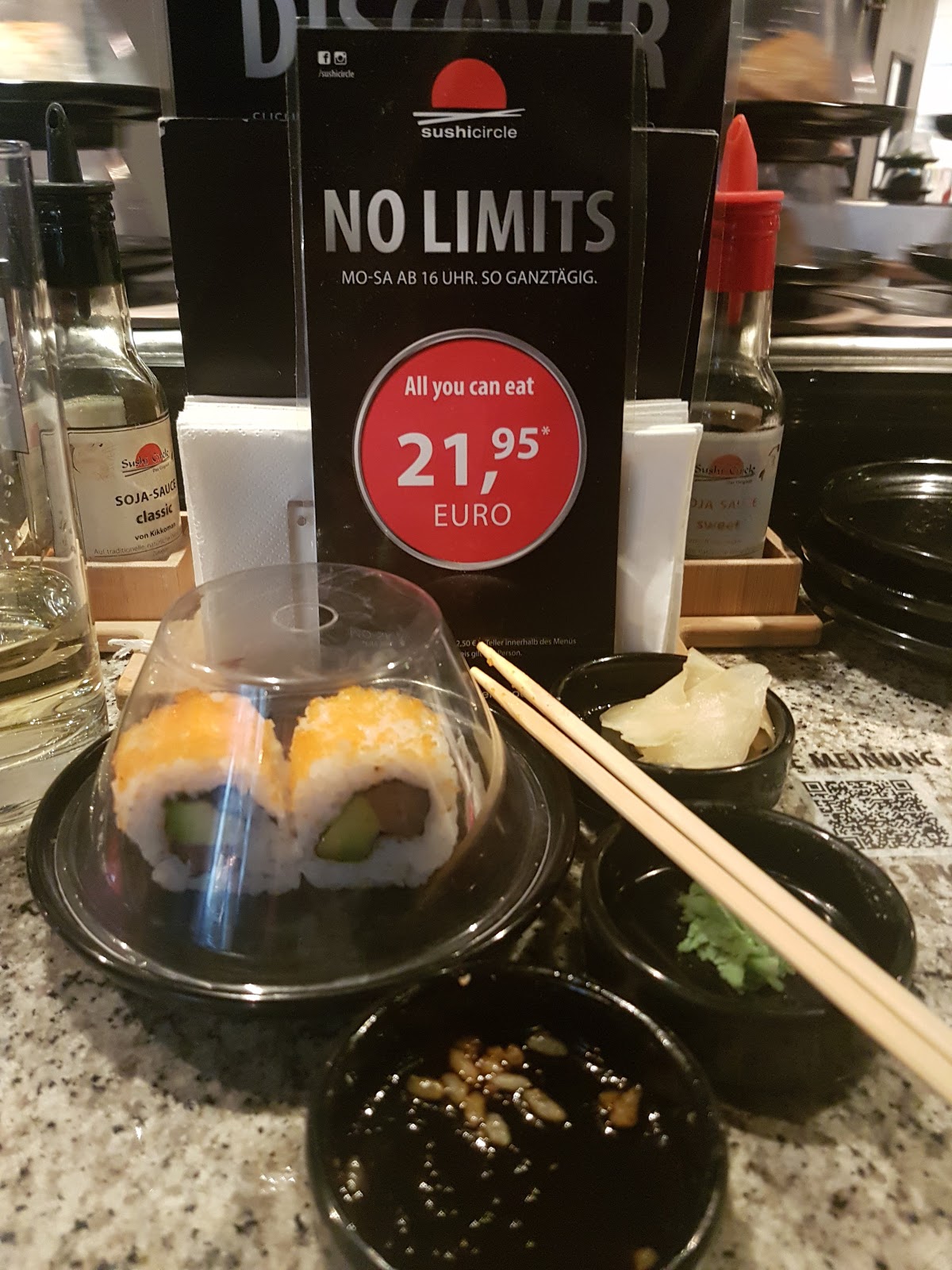Really good SUSHI! Fast, delicious, variety, good Price! They have an all you can eat for a very good Price. The Sushi go and go in front of you. Is a dream for a sushi lover. They also give soup and desert . Deserts are good.
