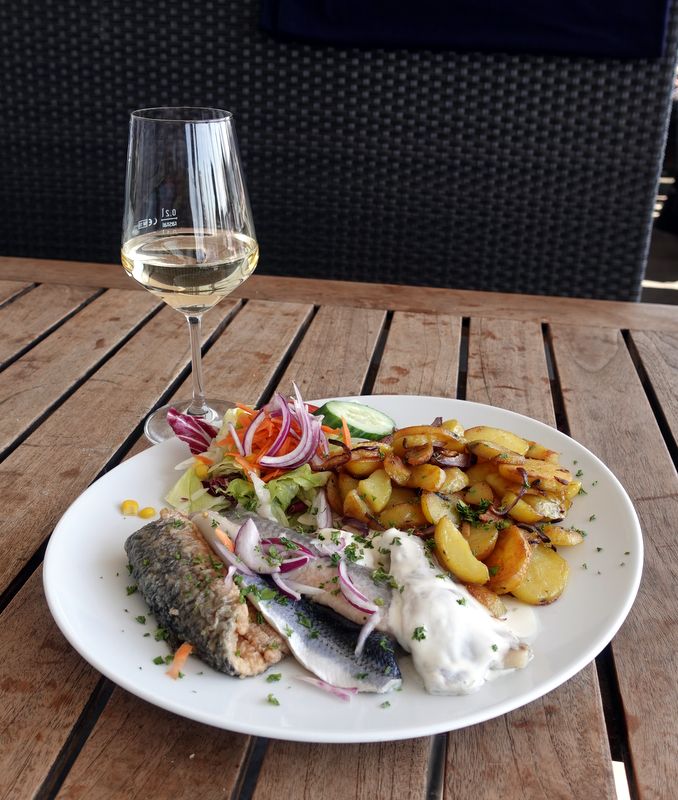 Nice place on the river serving good food at a decent price. The fried herring (~15€) was tasty, and came with a side salad as well as fried potatoes. Menu had everything from baked potatoes to burgers/sandwiches to many fish dishes. Good choice for a warm evening in St. Pauli