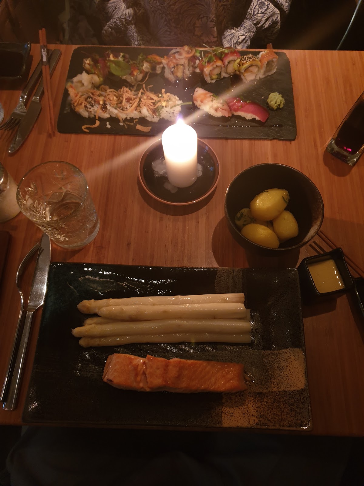 (Translated by Google) We were there for dinner. First, you get a greeting from the kitchen with home-baked, salted crackers with a delicious curry cream which fits very well together. I had salmon with asparagus and boiled potatoes. Everything was in a nutshell, icy and delicious. The hollandaise sauce was a bit too fluid for me. My wife had the mixed sushi plate. It was very nice but tasted rather boring. Overall, rather average sushi. The dessert, a creme brulee of white chocolate with coconut meringue was awesome. However, the espresso did not deserve his name, rather a small coffee. The atmosphere and decor is something special, maybe a bit dark but very nice. The service was very friendly and accommodating. A total of 4 stars, 1 star deduction for the sushi and the espresso.