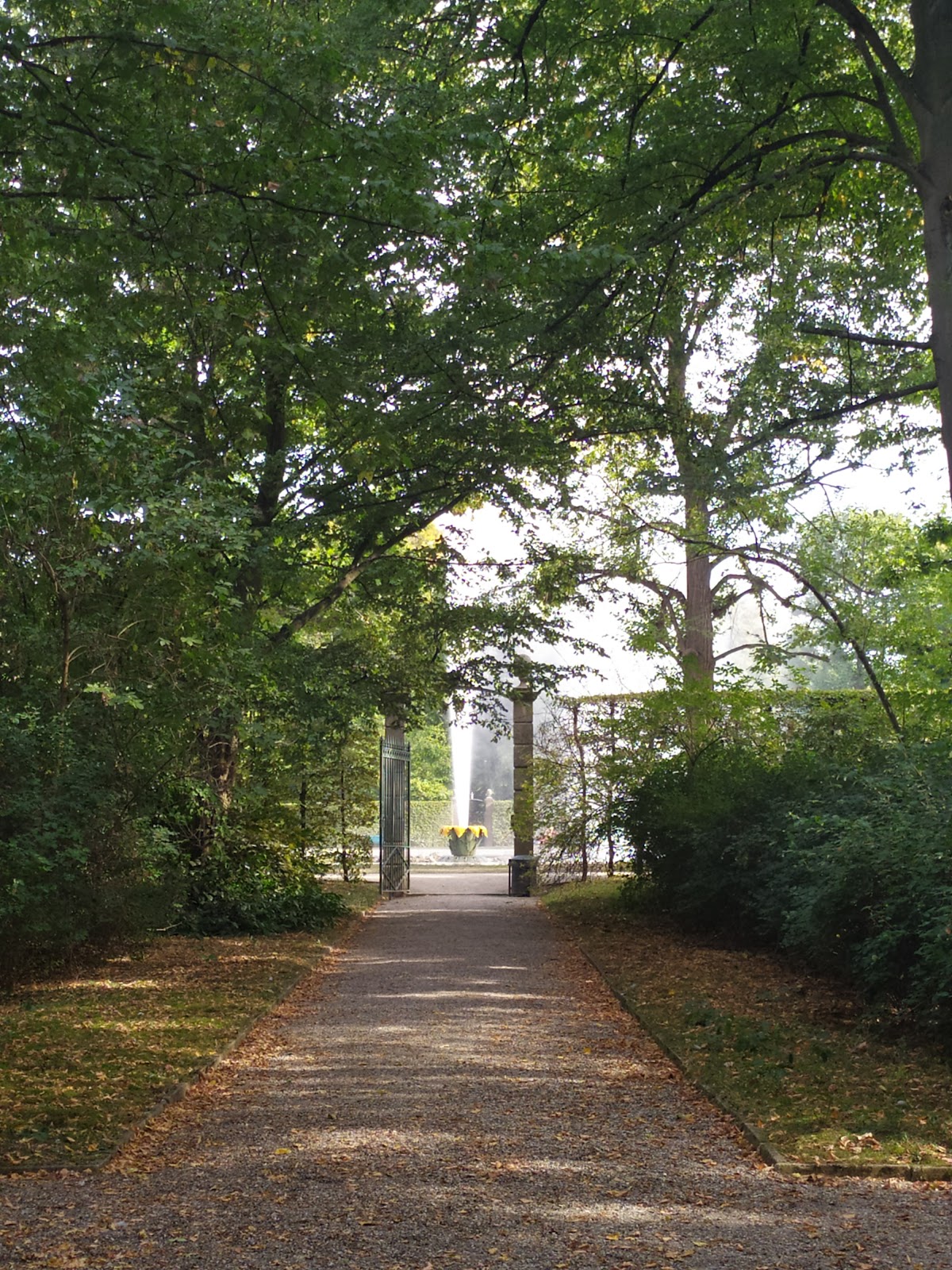Zentral die Fontäne, mit einem großen runden Becken und einem breiten Weg herum. An den Seiten stehen Bänke und es führen kleine Tore in umliegenden Gärten. Hier, in der natürlicheren Umgebung zwischen den Bäumen und Sträuchern, schaut man direkt auf die Fontäne.
