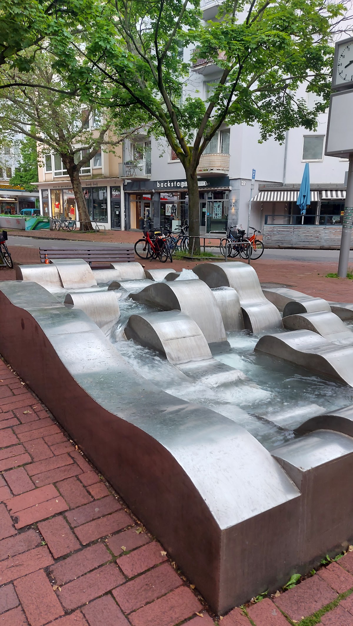 Lüders-Brunnen - Wassergarten. Errichtet 1974 aus Mitteln der Stiftung des Schlossermeisters Henry Lüders. Geschaffen von dem Bildhauer Joachim Wolff". Um den Brunnen herum sind ein paar Bänke platziert, die zum Verweilen einladen, während die Kinder im Wasser spielen.