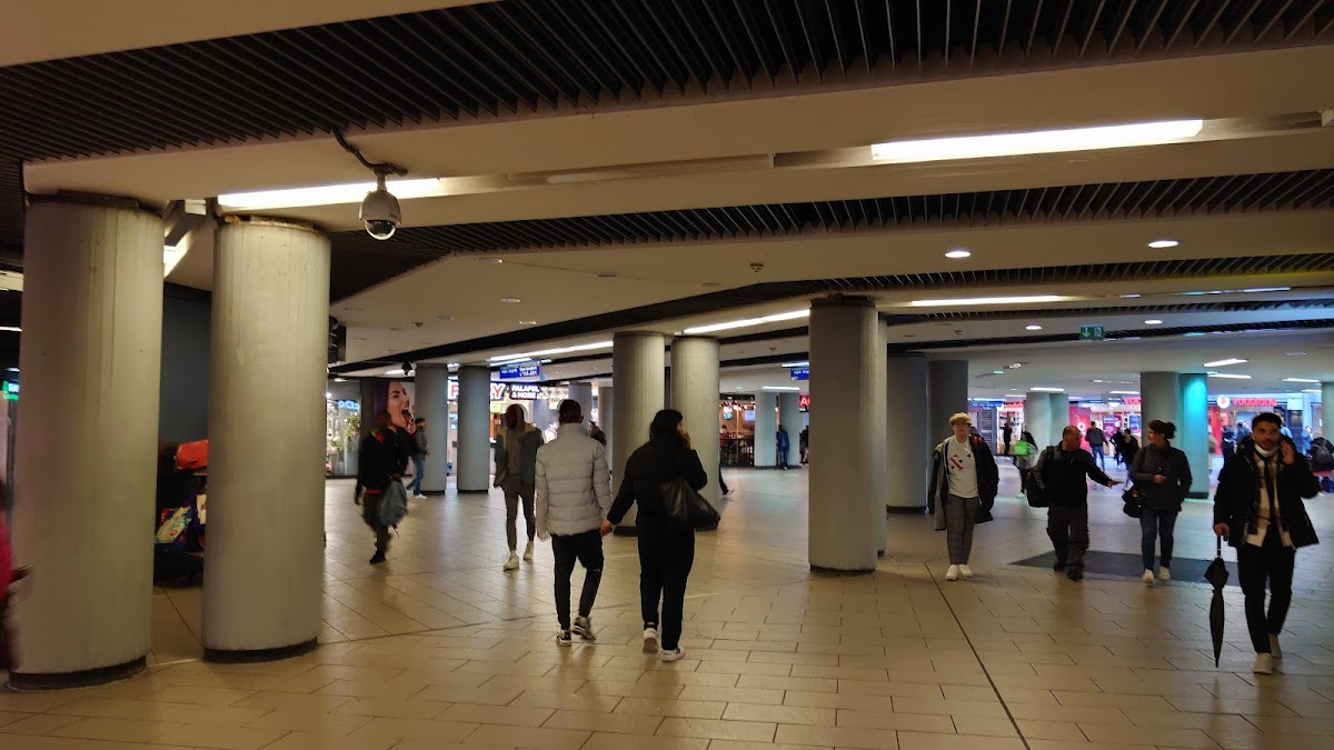 Big shopping promenade downstairs with many shops and cafes that starts from the train station. Stairs down are located near the Ernst August monument and also in a few times along the street.