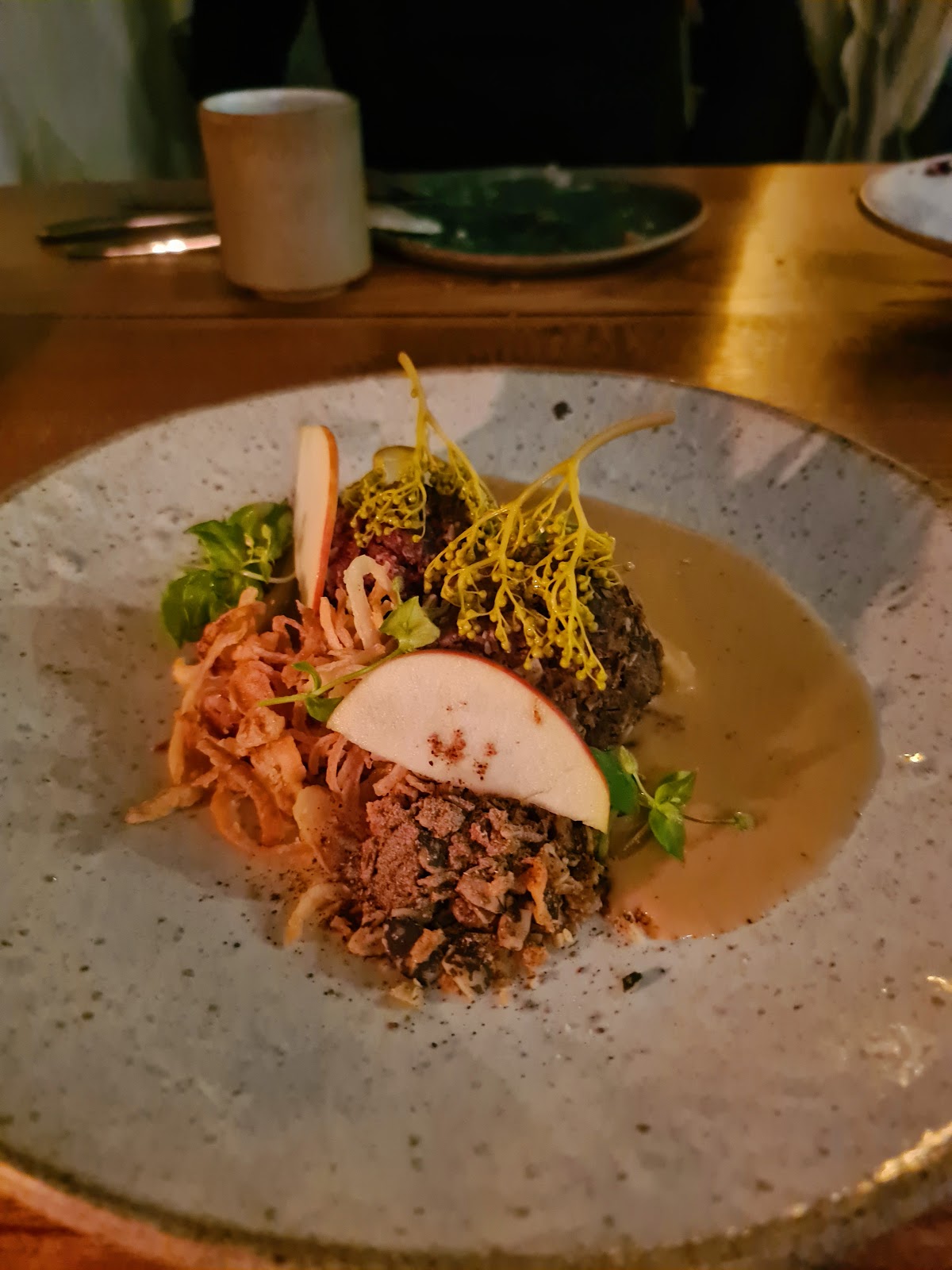 Richtig tolle, inspirierende, vegetarische Küche! Unser Highlight war ein Sellerie-Carpaccio mit knusprigen Zwiebeln und frischem, geriebenen Rettich.