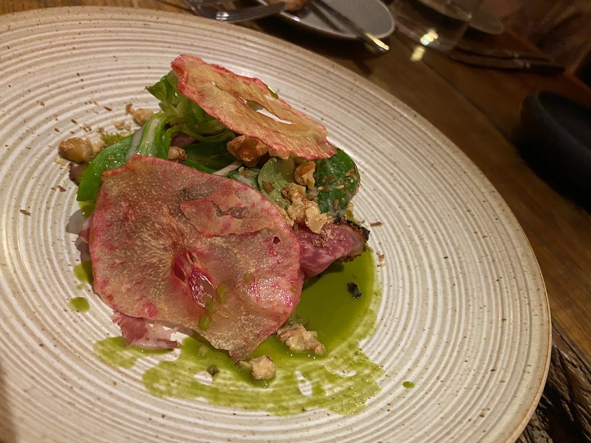 (Translated by Google) A fine evening at Schubert's: beautiful restaurant, nice and attentive service, ambitious cuisine, with a mix of different influences (not just French, but also Italian, Spanish and Portuguese). Great vegan dishes! The Riesling sparkling wine was excellent! Better than some champagnes. Interesting (and clean of course!) toilets upstairs. Overall the food was very good, if not perfect at times. The mise-en-bouche was delicious, but the amuse-gueule was banal, the pot-au-feu of mussels didn't taste like pot-au-feu. The meat from the coq-au-vin looked surprisingly light, maybe not braised in red wine after all, but it was really juicy and tender. The fish (catfish fillet) was a bit too dry although cooked sous vide. But the plate was set up really creative. Or the sauce from the mushroom ravioli was too intense for the actual dish. Desserts were fine. The background music was sometimes too dominant and for us stylistically it didn't always match the venue. But overall we had a nice evening.