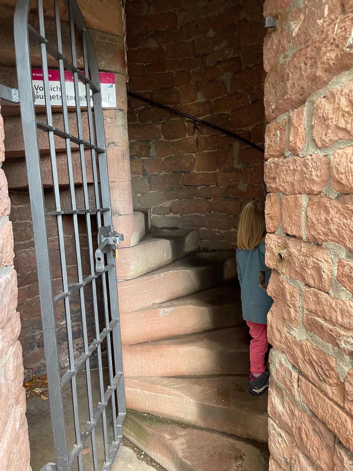 A beautiful tower with stellar views of Heidelberg. There is an exterior staircase leading up to the interior staircase, which had sturdy stone steps, a metal railing, and slightly dim light at times. The top of the tower is open but has a railing encircling the entire stairwell in the middle, and you're able to walk all the way around the top enjoying the view. There are high walls that gave me no anxiety having my three kids ages 6, 4, and 2 years with me, other than the potential for falling down the stairs. I wore the toddler but the other two were able to climb up without difficult and only minimal complaining. While the tower is free, make sure you check opening hours before coming if this is on your bucket list.