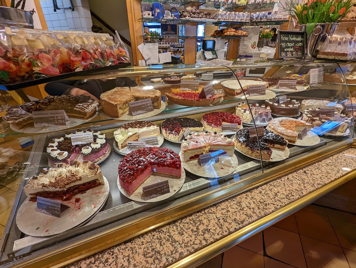 Got takeaway of 3 different cake slices, all ended up being delicious. Also asked for a white chocolate Kurfürstenkugel but when I checked at home it was a dark chocolate one. They don't take credit card which is cheap and backwards of such a big bakery in 2022. Reflects bad on them